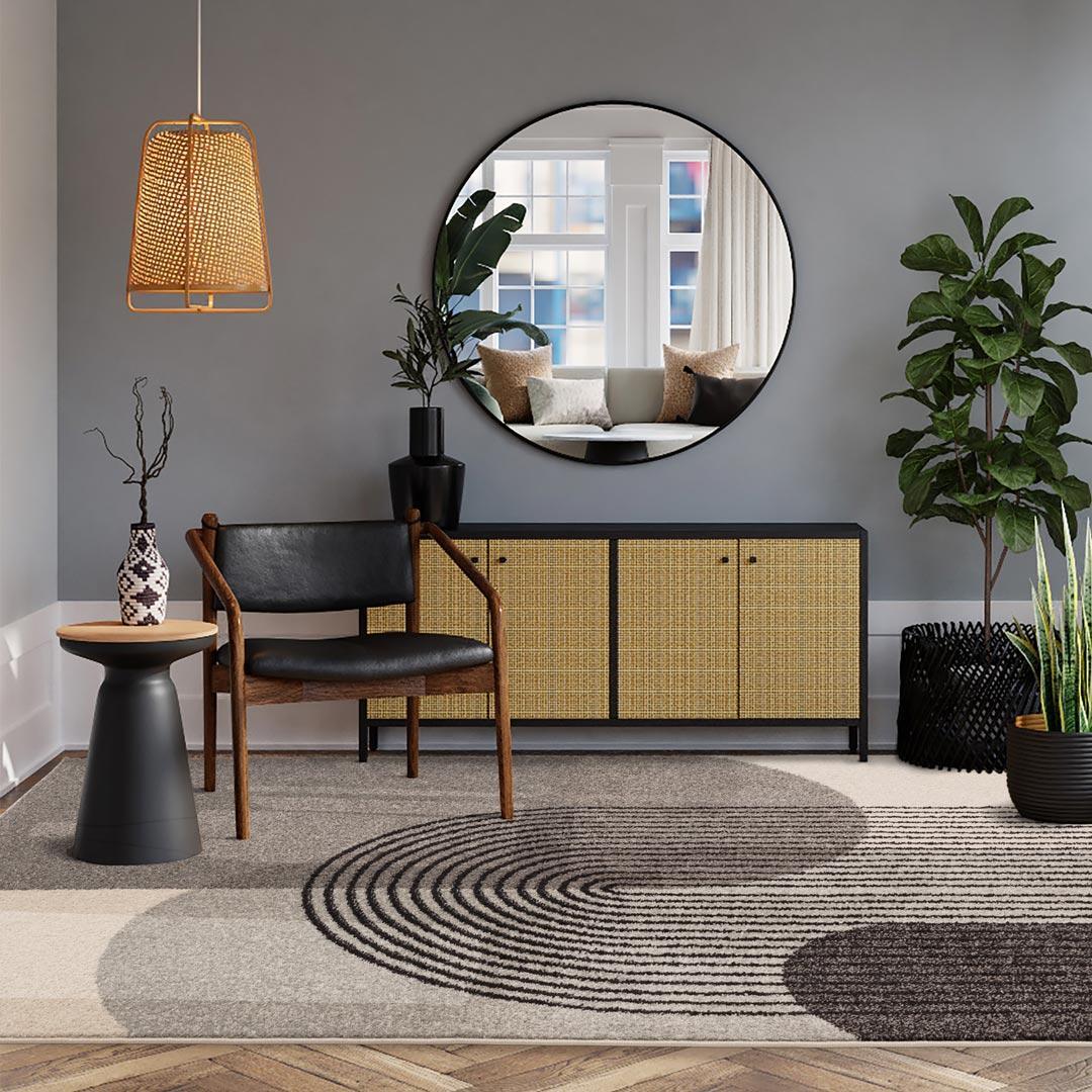 The grey and black geometric pattern adds a modern twist to the classic retro aesthetic. This grey rug is versatile and can effortlessly complement a variety of interior schemes. However, it truly shines in a mid-century styled home, becoming a statement piece that ties the whole room together.