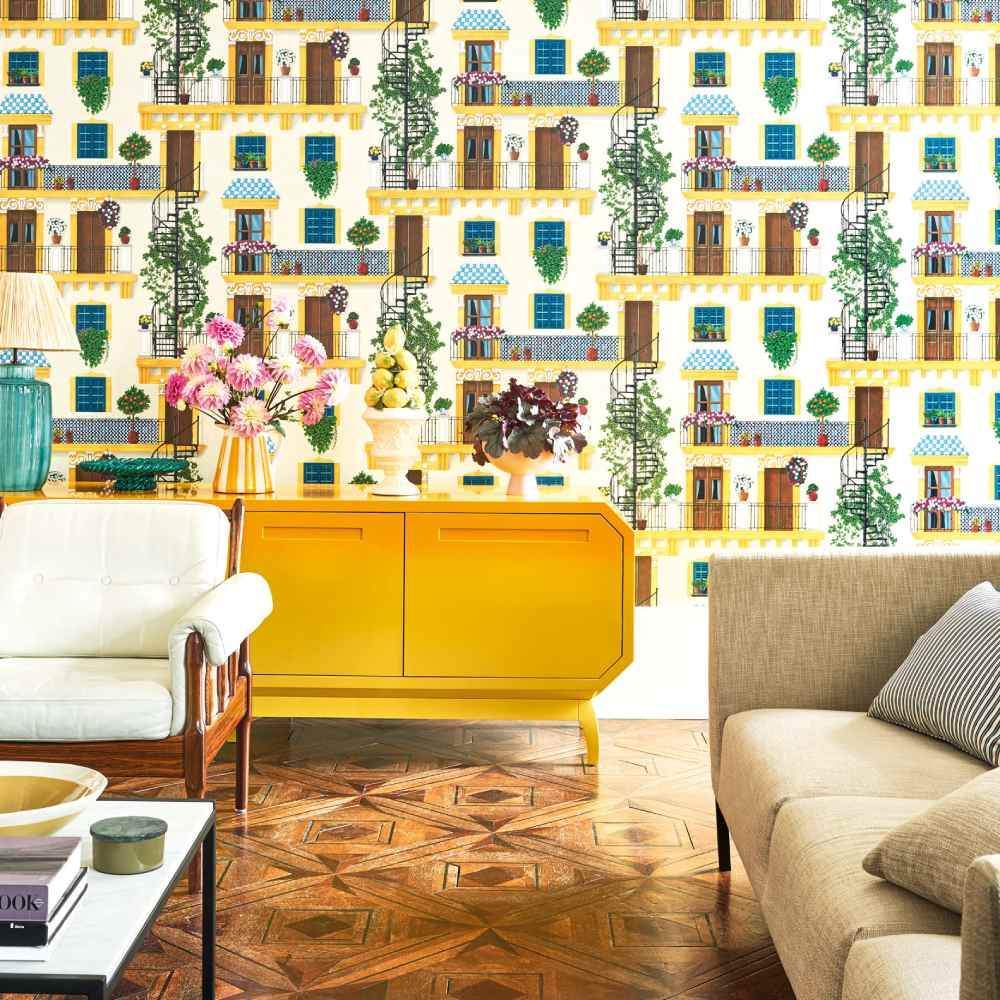 The iconic balcony scene in Shakespeare’s Romeo and Juliet is said to have been inspired by The Plaza Alfaro residence in Seville. The sunshine yellow paintwork, wrought iron balustrades and blooming tropical flowers create a real wow factor wallpaper with lots of intricate interest.
