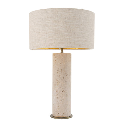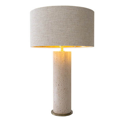 The Maltere Table Lamp is a tribute to form, texture, and subtle contrast. At its core stands a solid travertine cylinder, its warm, porous stone surface rich with character and timeless beauty. Anchoring this sculptural centerpiece is a slim antique brass plate, adding a delicate gleam and grounding the piece with refined structure.