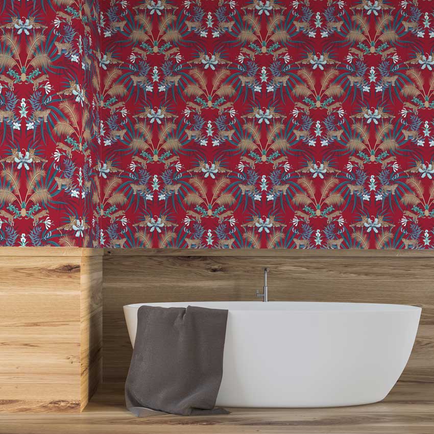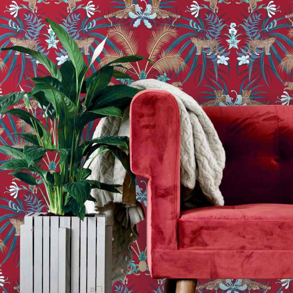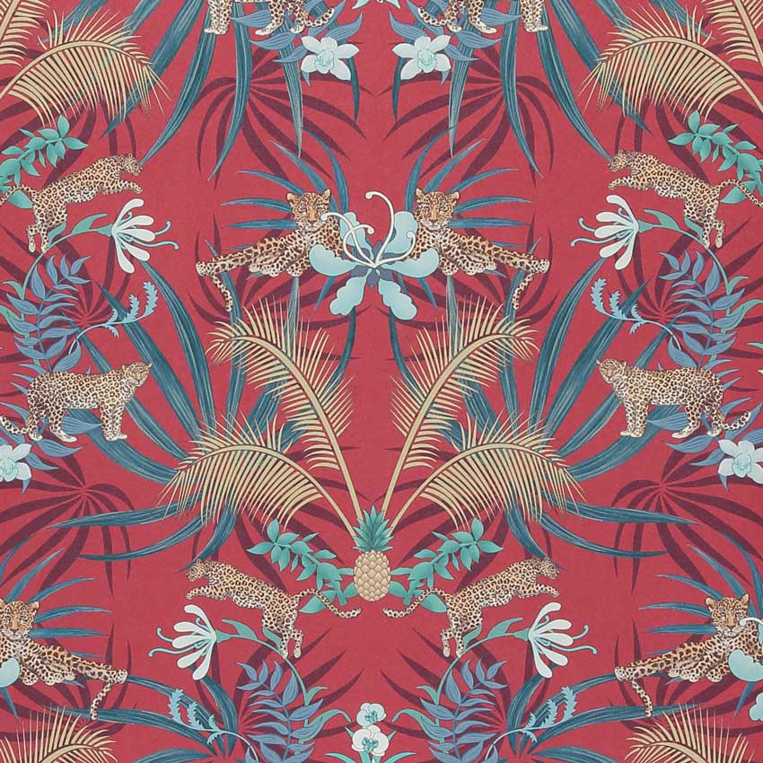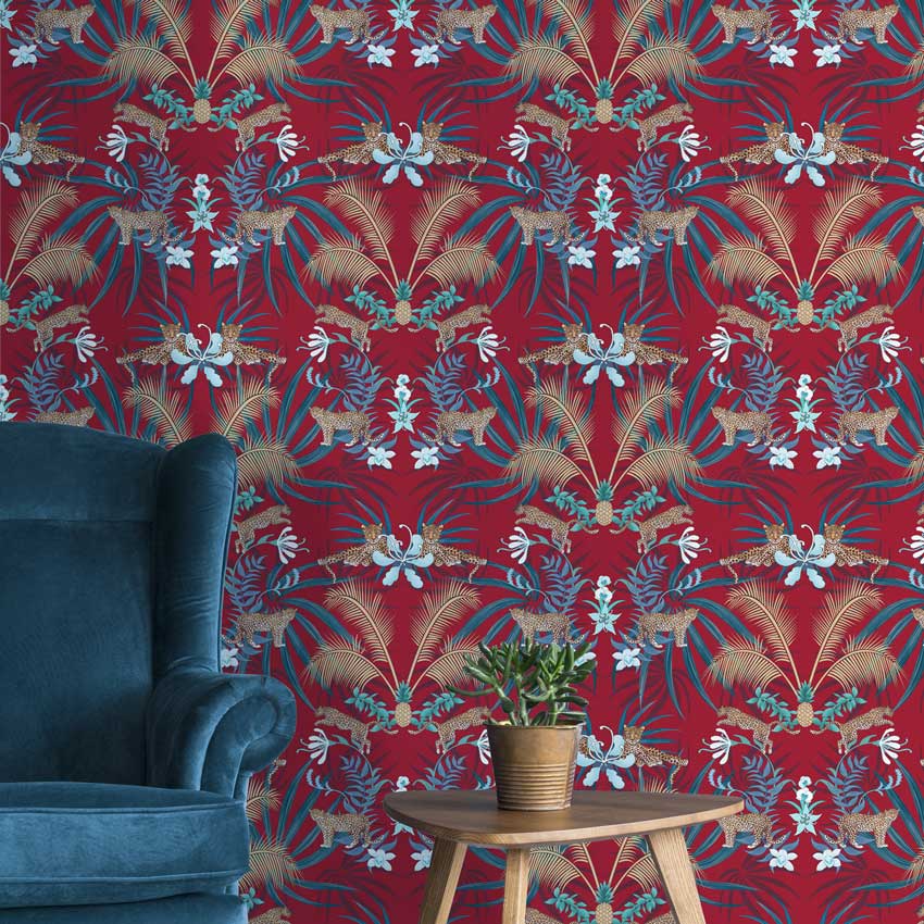 Add a̴ sense of glamour to any room with our stunning Leopard Luxe Wallpaper designed by Becca Who for Graduate Collection. Set on a gorgeous Red background, this simple yet striking wallpaper design features leaping leopards prowling amongst golden palms and pineapples, resulting in a majestic design of striking elegance, which creates a beautiful focal point in an interior.
