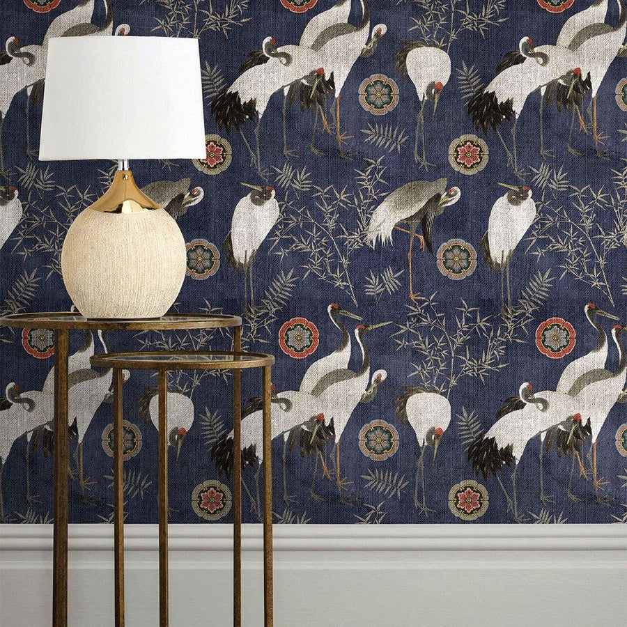 The striking Tsuru Indigo Wallpaper by MINDTHEGAP pays homage to the Japanese cranes, known as a symbol of luck, longevity, and fidelity.