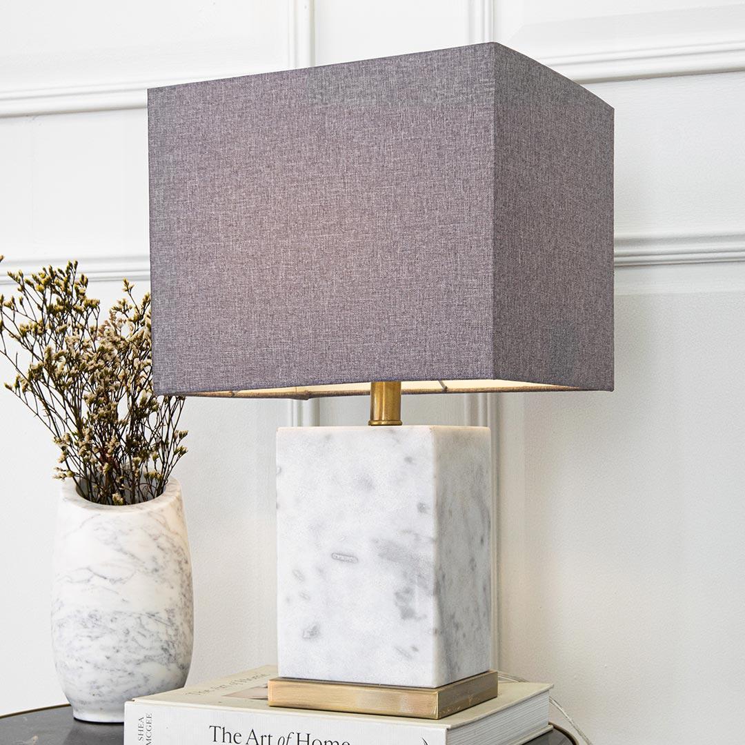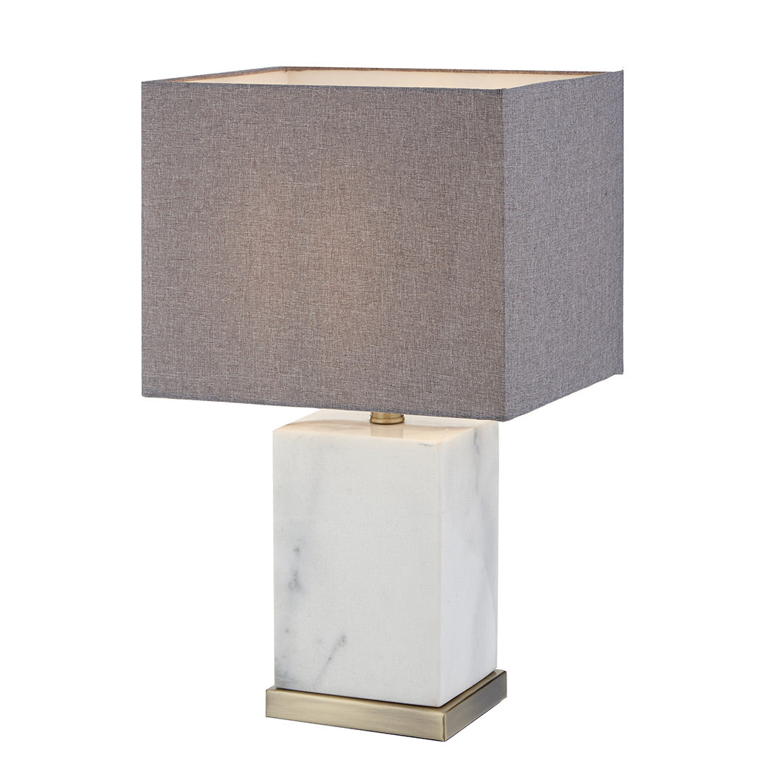 The Abella Table Lamp showcases a stunning white marble base paired with a sleek rectangular fabric shade, adding a touch of modern luxury to any space. Each lamp is uniquely crafted, featuring natural grey veining and subtle hues in the marble, ensuring no two are alike. Resting on an antique brass plinth, this lamp effortlessly elevates the style of any room it graces.
