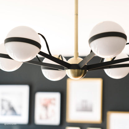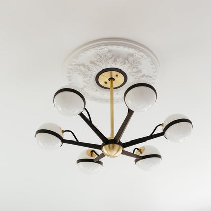 The intricate asymmetrical diffusers, crafted with beautiful opal glass, throw light into every corner of your space. Suspended in a hand-worked black iron ring, this chandelier adds a rustic flair to its sophisticated styling. Perfect for dining and living areas, the Ace Chandelier is sure to be the elegant centrepiece of your room.