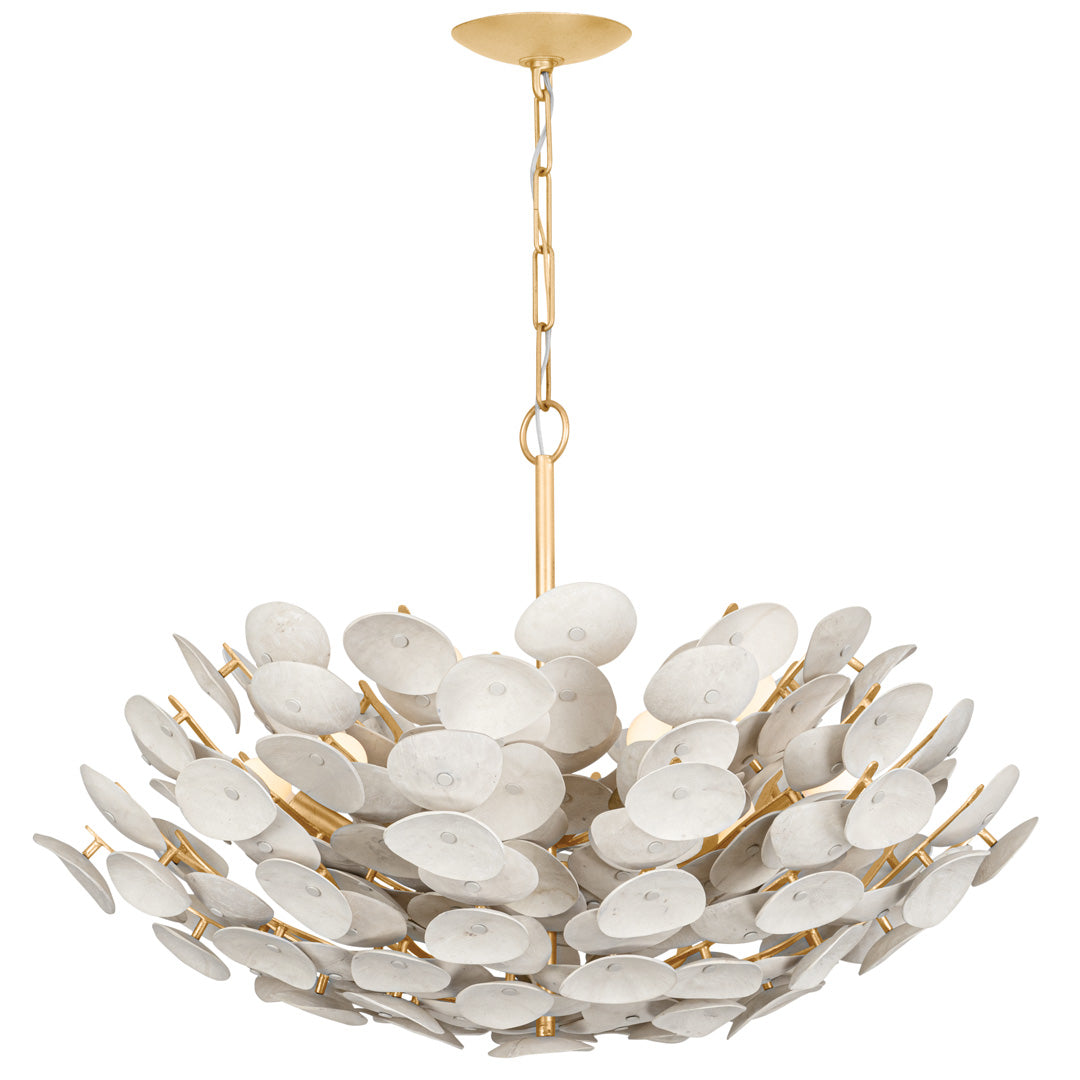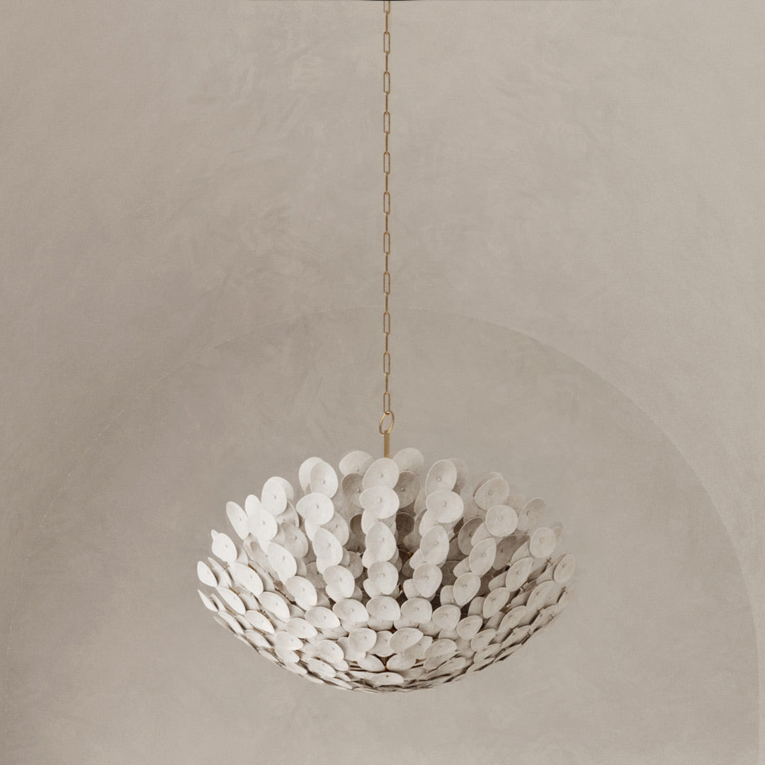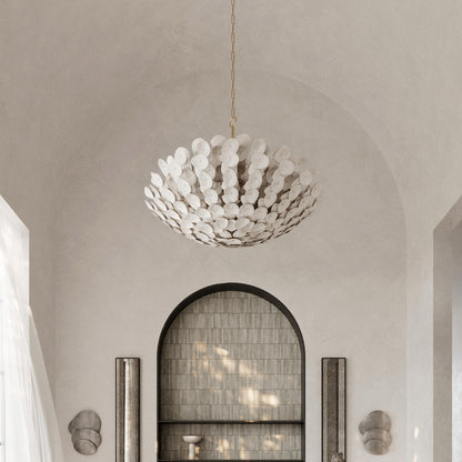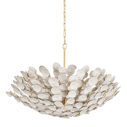 The Aimi Chandelier by Hudson Valley Lighting is the epitome of luxury and elegance. Crafted with delicate discs of white-washed coco shells, this grand chandelier exudes a natural and organic feel, while its Vintage Gold Leaf frame adds a touch of opulence.