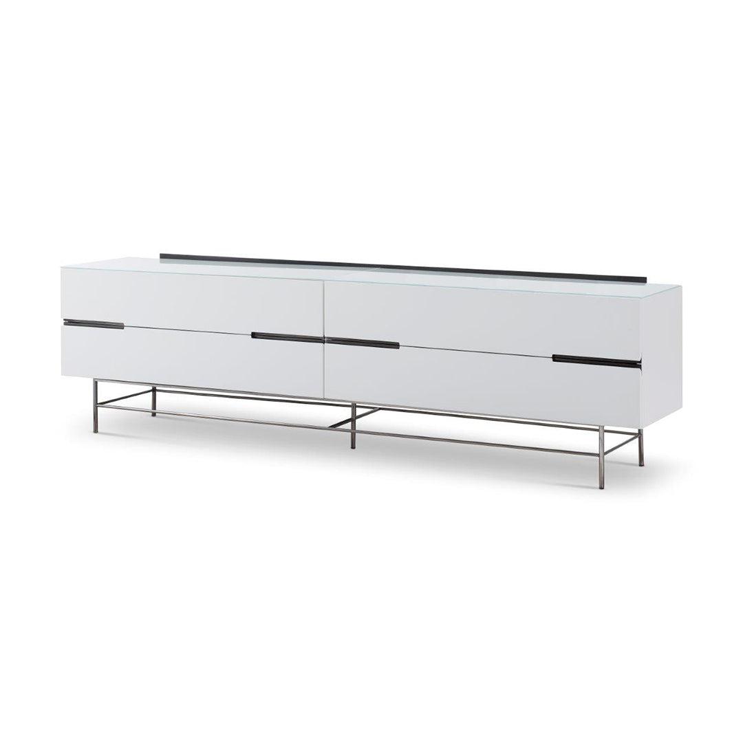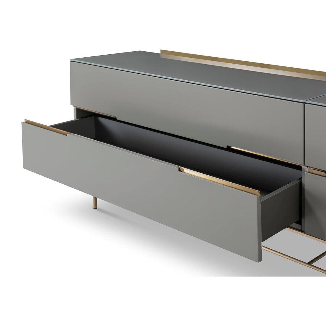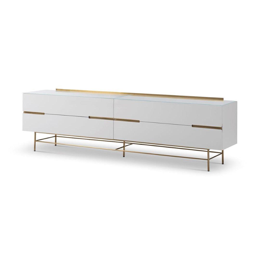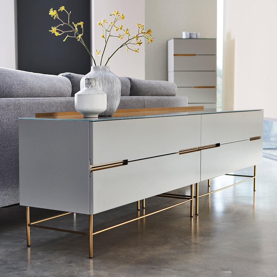 The Alberto 4 Drawer Low Sideboard is an elegant piece of high end furniture, designed here in the UK by luxury furniture company Gillmore. With a matt lacquer finish, and a choice of trendy brass accents or sleek stylish dark chrome accents, this piece is a perfect addition to our designer living room furniture range.