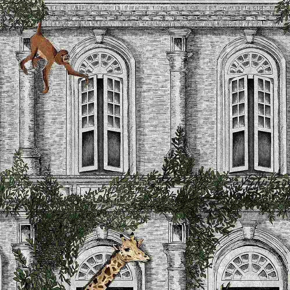 Animal Architecture is an extraordinary hand sketched design with amazingly intricate architectural detail on the building where mischievous monkeys and elegant giraffes catch a view to the world.