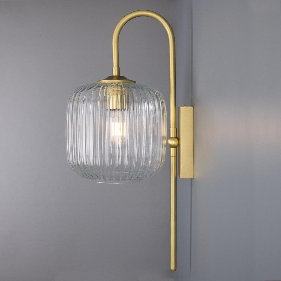 The Astoria Reeded Glass and Brass Wall Light is a stunning example of mid-century modern design. Its iconic and timeless aesthetic is highlighted by a beautifully crafted cylindrical 20cm reeded glass lamp shade. This unique shade is delicately suspended from a gracefully curved brass arm, creating an elegant and sophisticated visual appeal.