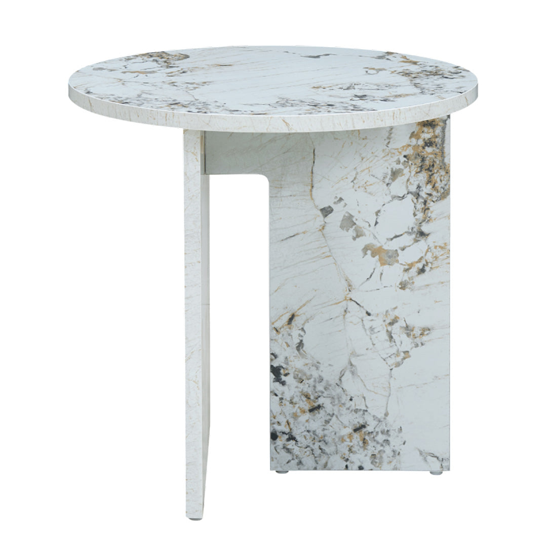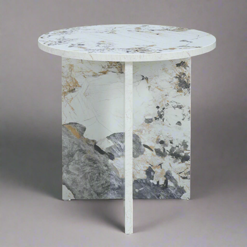 The Auro Marble Effect Side Table is a striking addition to any living room, showcasing a sophisticated design. This modern side table has an elegant round top, crafted to resemble opulent marble, and exudes a sense of luxury.