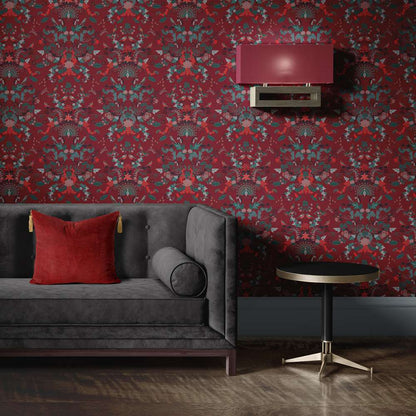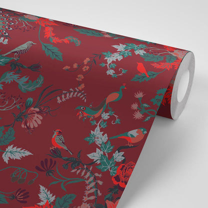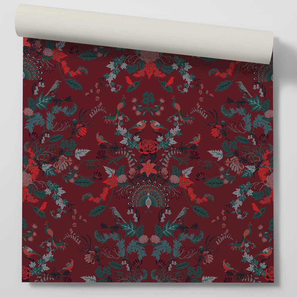 Aviana is filled with birds amongst florals. The Ruby colourway of Aviana offers a Claret background, complimented by touches of Scarlet red and rich Teals. Filled with birds and florals, this decorative design adds drama and warmth to an interior.