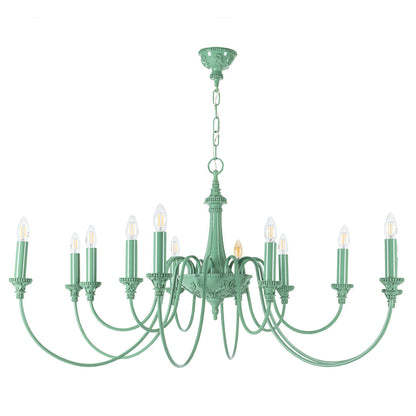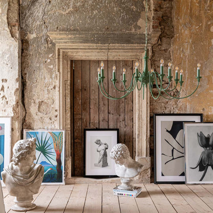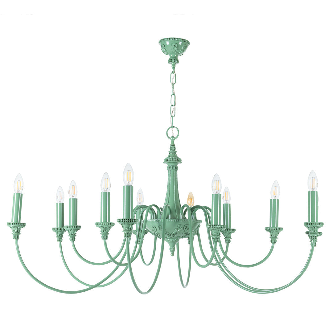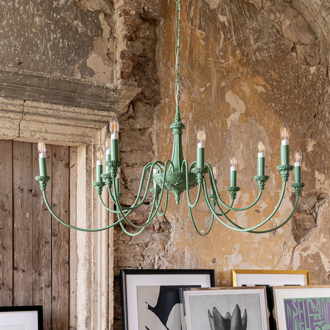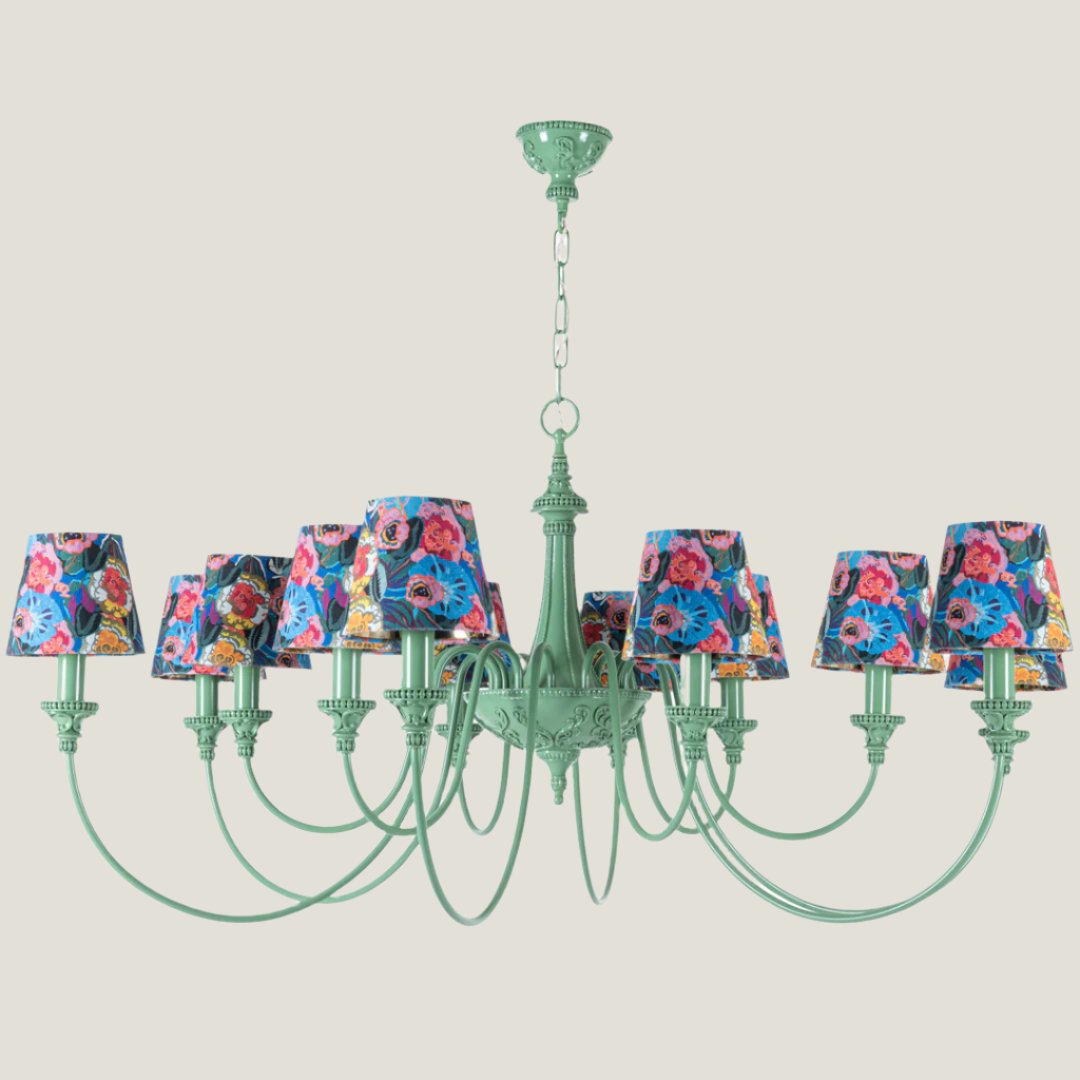 The sage green chandelier has delicate leaves, that seemingly danced in the soft glow of twelve lights, creating a mesmerizing visual experience. As the light bounces off the glossy finish, it evokes a feeling of tranquillity, making it the perfect colourful chandelier for any room that needs a touch of serenity.