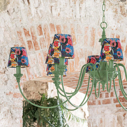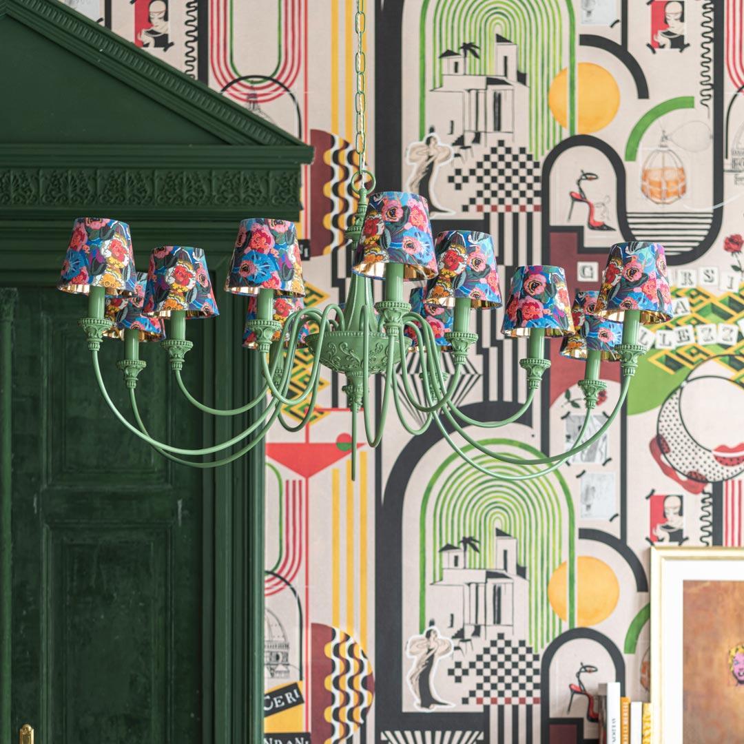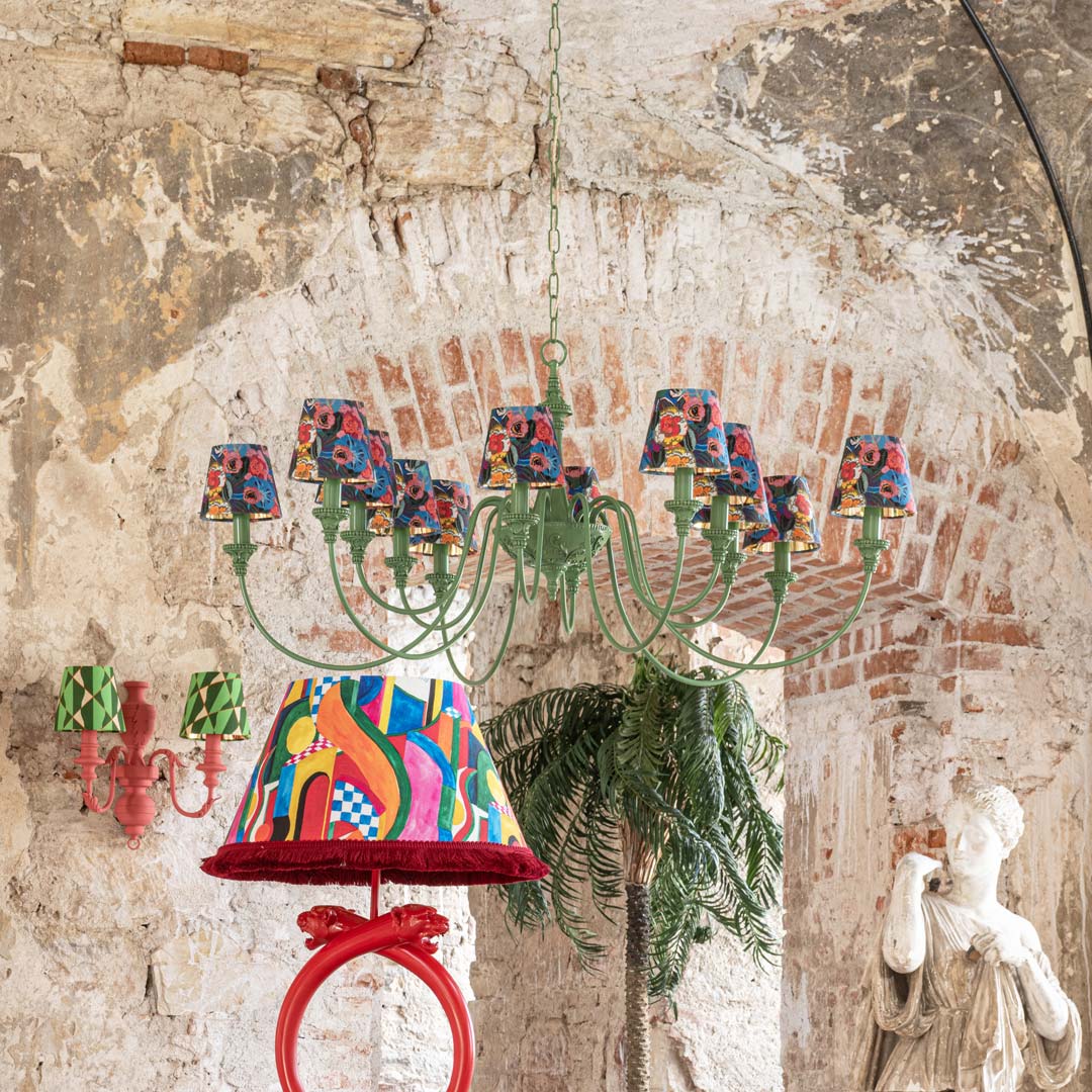 The MindTheGap Chandelier becomes even more alluring when adorned with the Fiori in Fiore lampshades. With intricate patterns of blossoms printed on luxurious linen and finished with a touch of gold metallic lining, this coloured chandelier becomes a mesmerizing representation of a blooming Tuscan garden.