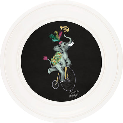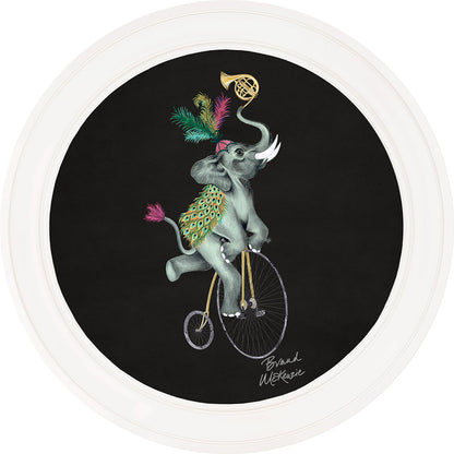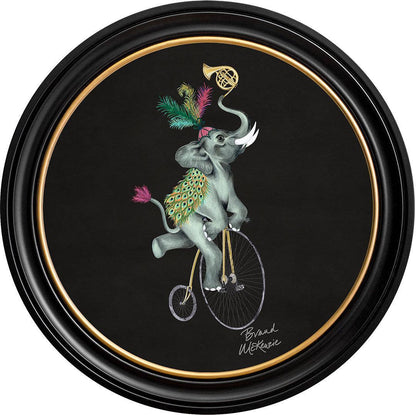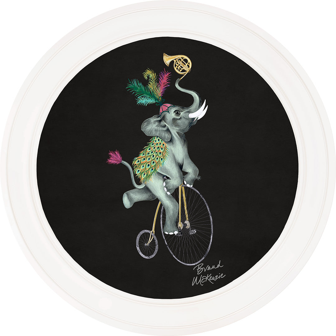 Step right up and meet Elliot! This captivating framed art print from the Brand McKenzie collection showcases a truly unique character. Elliot, a whimsical elephant with a flair for the dramatic, expertly navigates life's adventures atop his classic penny-farthing.
