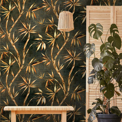 The Forest Green Bamboo Wallpaper is the most serene wallpaper design. This beautiful wall covering is hand painted in natural hues of greens and gold from the bamboo stalks. The silk texture background creates a sense of luxury and sophistication, making this wallpaper perfect for any space.