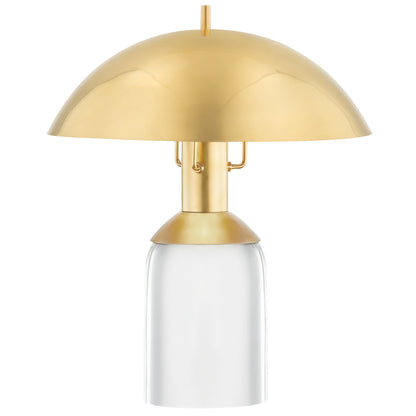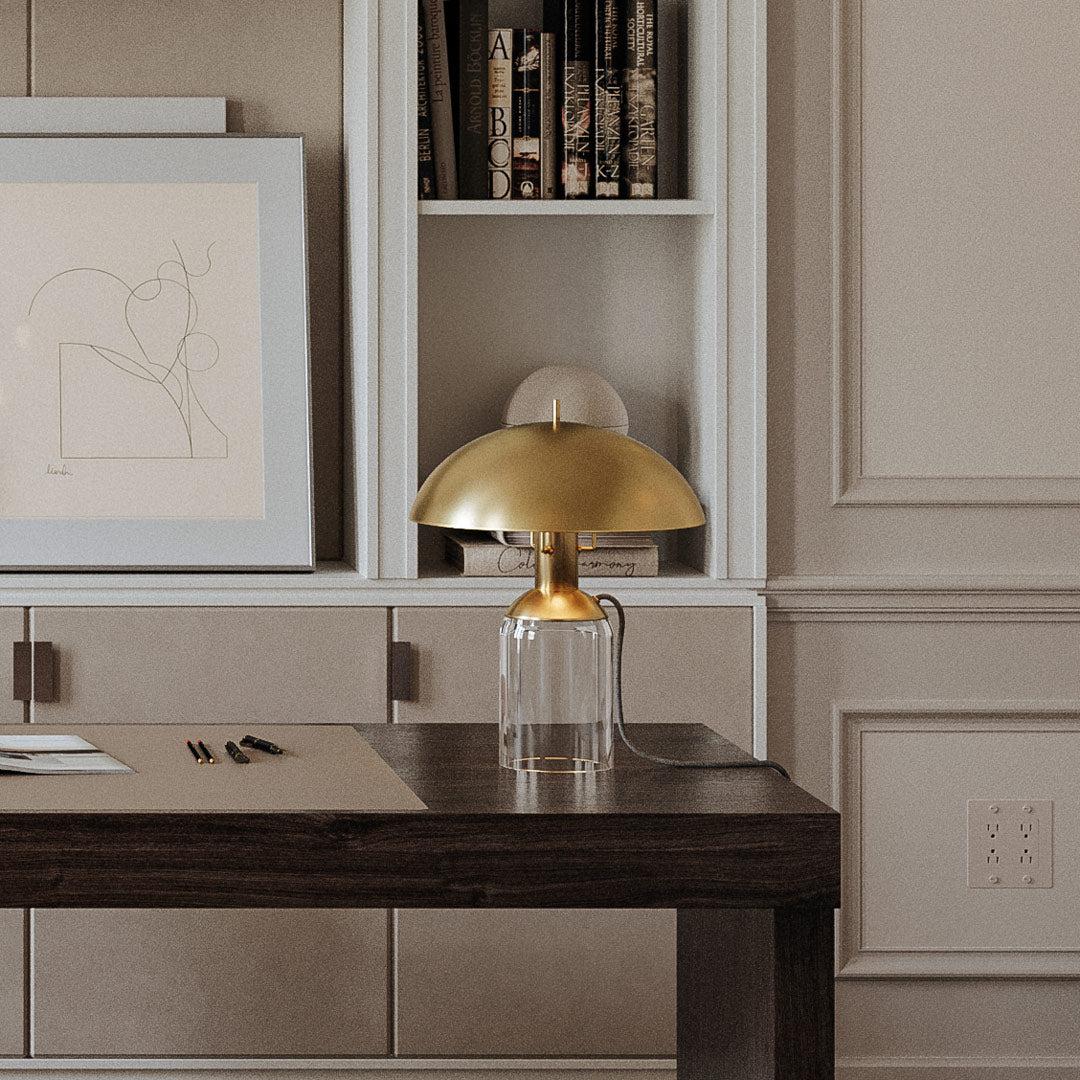 This designer lamp features a brass dome shade and a clear glass base that looks chic and sophisticated on any side table or desk. Its luminous glow gives a soft, inviting atmosphere to your living room or office. Whether you’re a fan of futuristic design or modern minimalism, this versatile lamp is sure to fit any contemporary aesthetic. Illuminate your space most stylishly with the Bayside Brass Table Lamp from Hudson Valley Lighting.