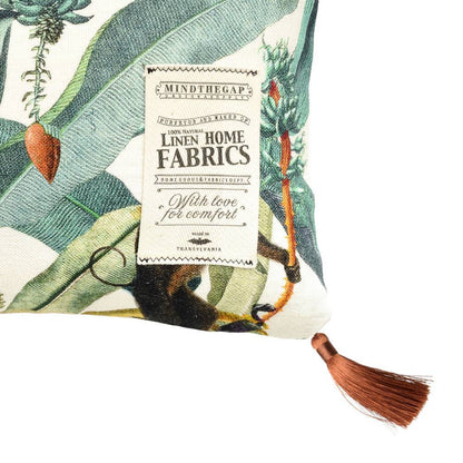 Made on heavy linen and printed by using traditional methods. To achieve a unique vintage effect and to get more softness, MTG linen cushions are stonewash finished. The fillings are made of duck feathers in order to keep the natural look of the cushion and also a good shape for long time to come. This stylish cushion is finished off with copper coloured tassels on the corners.