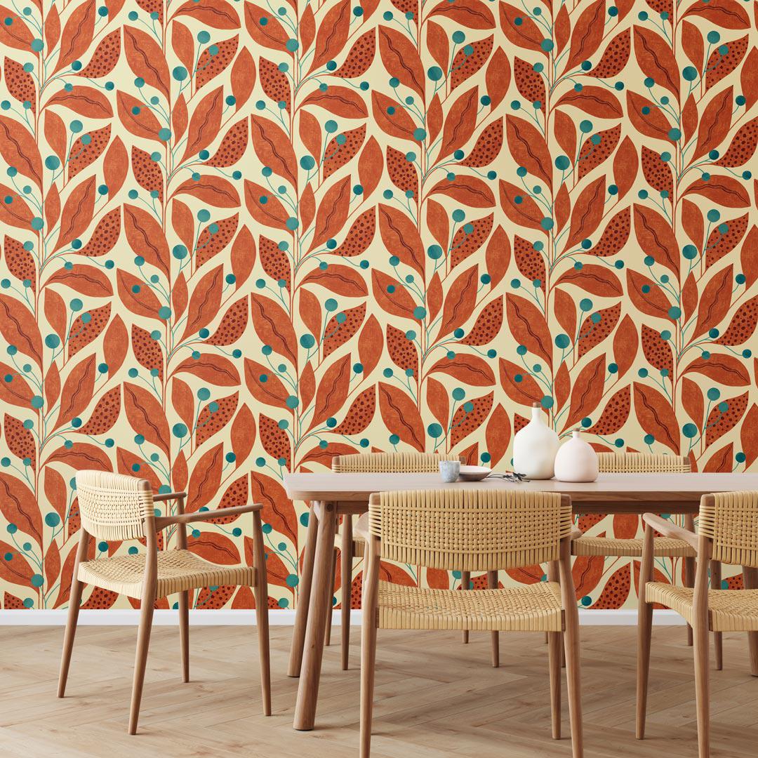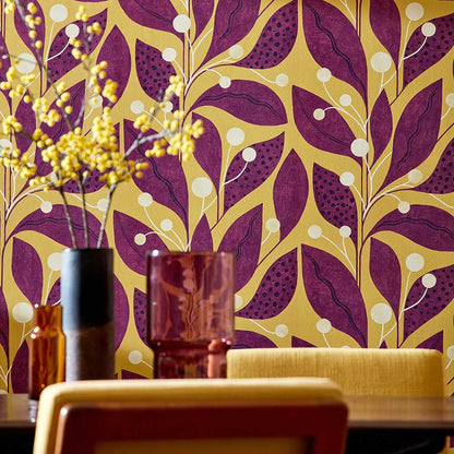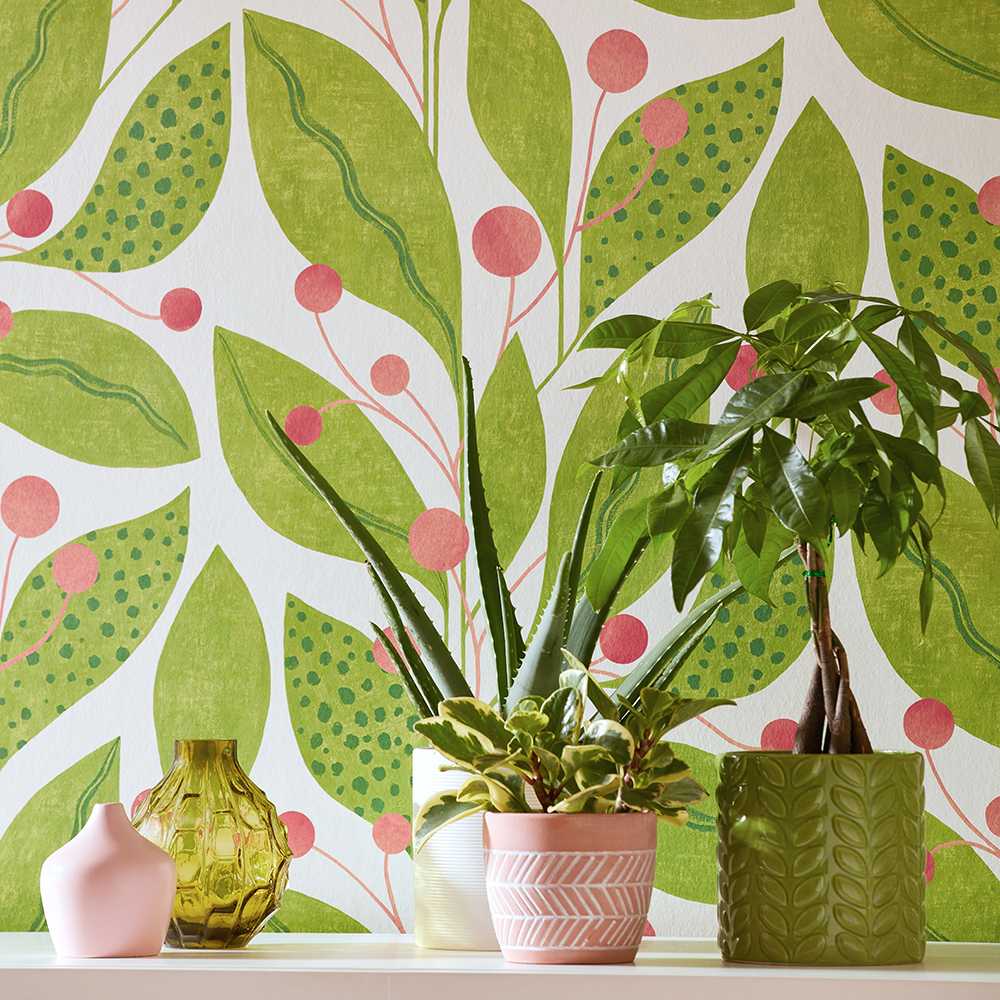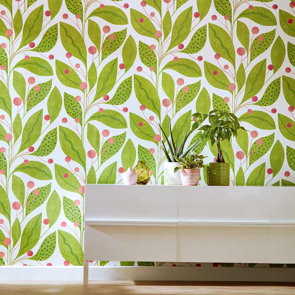 Bring some modern botanical style to your home with the beautiful Berry Dot Wallpaper by Ohpopsi.