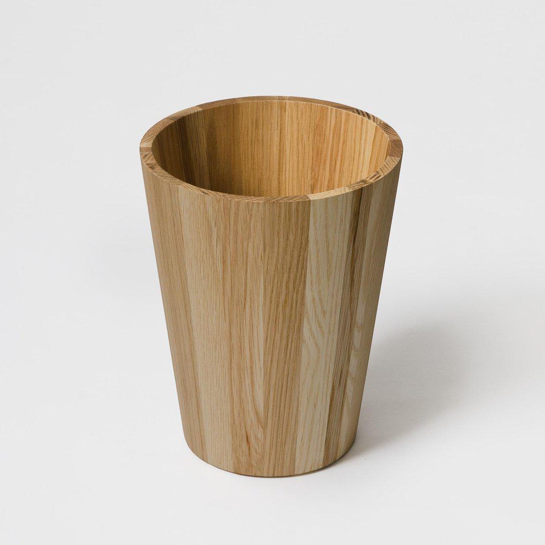 Individually assembled by hand, eighteen blocks of solid American white oak are laminated to form the conical shape. A squared top and bottom edge cut a contemporary look. Perfect for use in a bathroom, bedroom or office. It has been lacquered for water resistance and the bin is easy to wipe clean, making a practical yet stylish accessory.