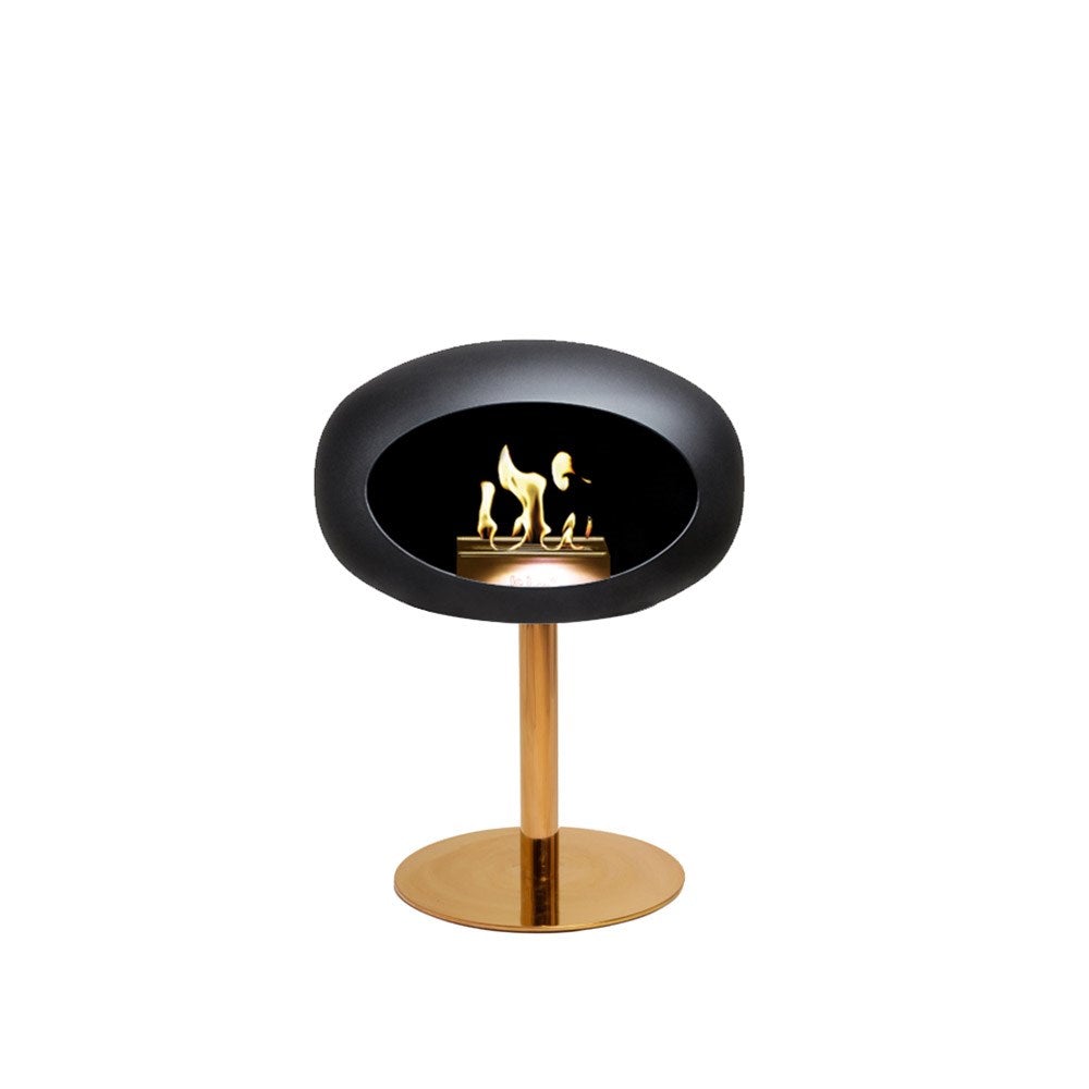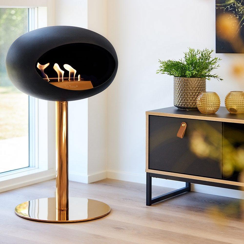 The Scandinavian inspired Le Feu Ground Steel bio-ethanol fireplace in a black finish has a 50cm Rose Gold stand and matching base creating a beautiful form and design.