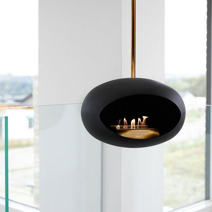 No chimney, flue or unsightly cables are required. This easy to fit hanging fire is great for a living room, kitchen, Orangery, dining room, restaurant, bar and location where warmth, distinction and elegance is desired. The matt black finish enhances and augments the glow of the flame and quickly radiates an efficient heat to create warmth and comfort removing the chill from cold living areas at home.