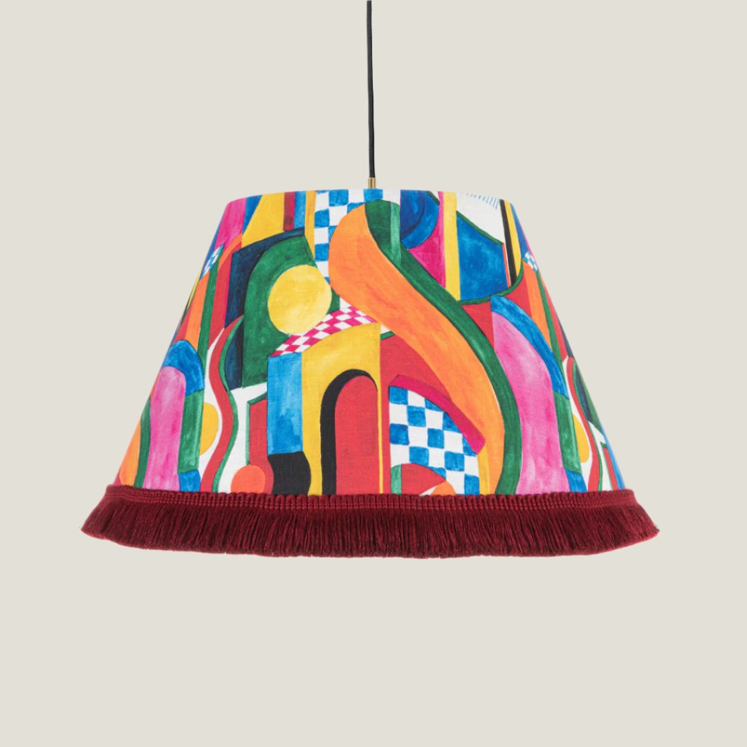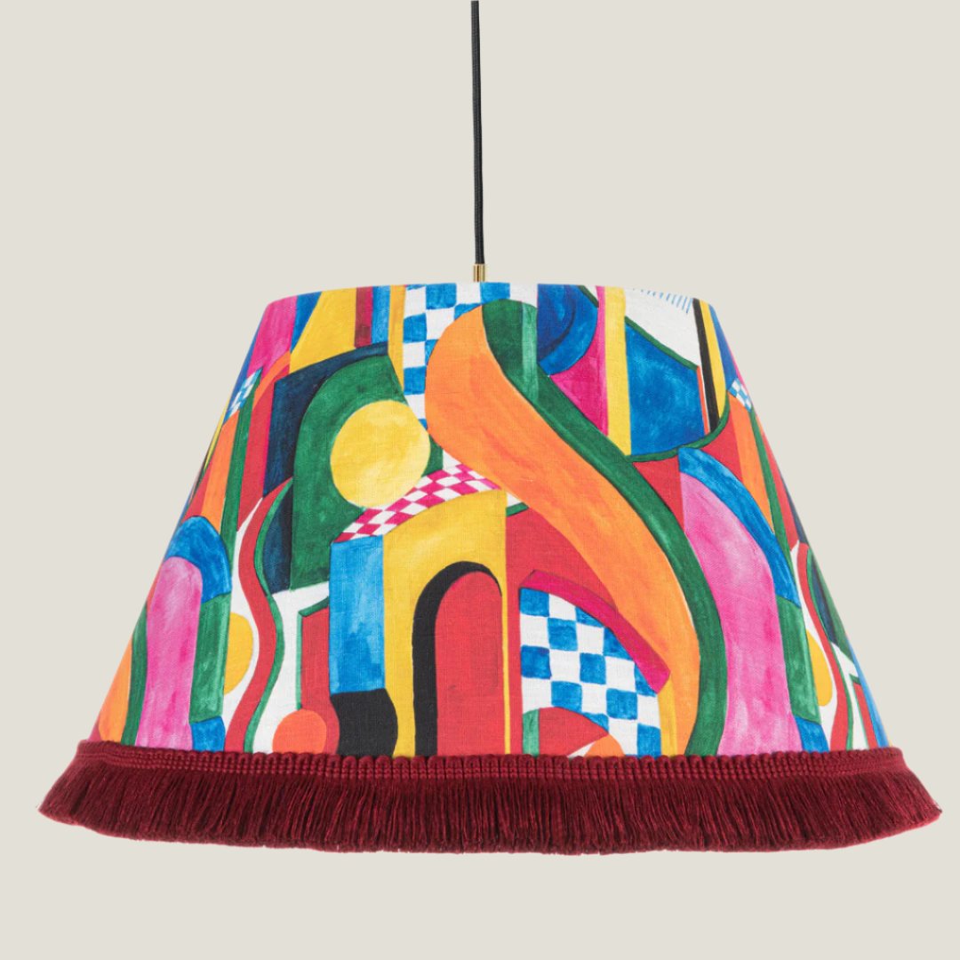 This modern pendant light is a true dance of geometry and colour, capturing the essence of the vibrant Bossa Nova music and culture. Bold primary colours, soft pastels, and dark red fringes combine in a compelling, sophisticated, playful blend.