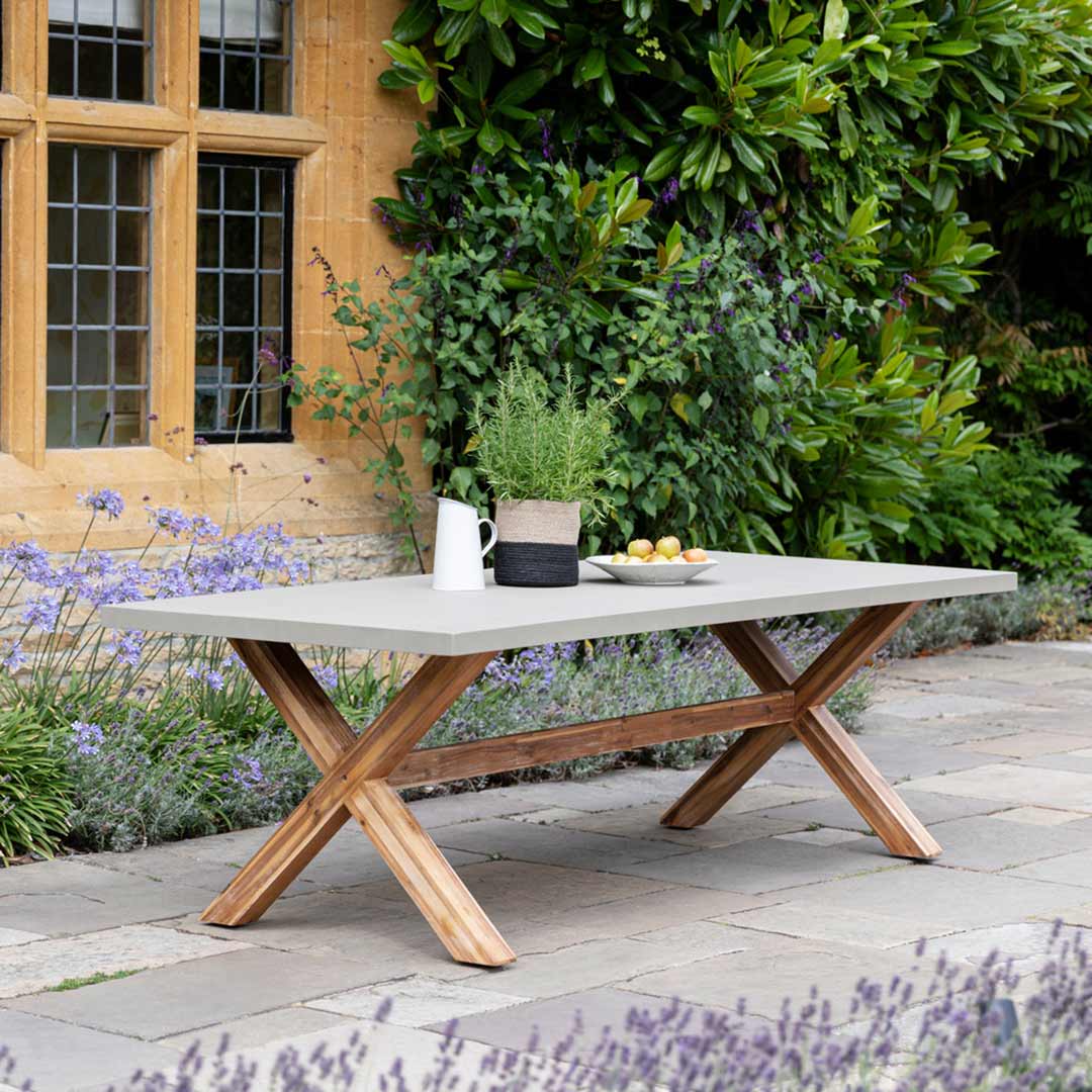 Welcome to the Burford Table. The perfect accompaniment for your garden parties or family gatherings. Crafted from robust, weatherproof poly-stone and sleek acacia wood legs, this contemporary piece will be an eye-catching addition to any outdoor area.