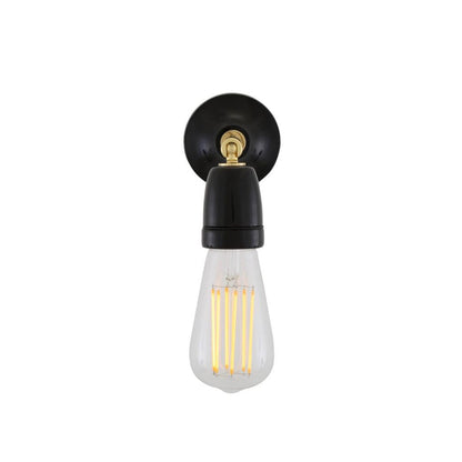 This modern monochrome wall light features a polished brass sleeve that extends from a black (or white) ceramic wall bracket. Attached to the brass sleeve is a ceramic E27 lamp holder and 360° swivel joint which allows the light direction to be adjusted and positioned as desired.