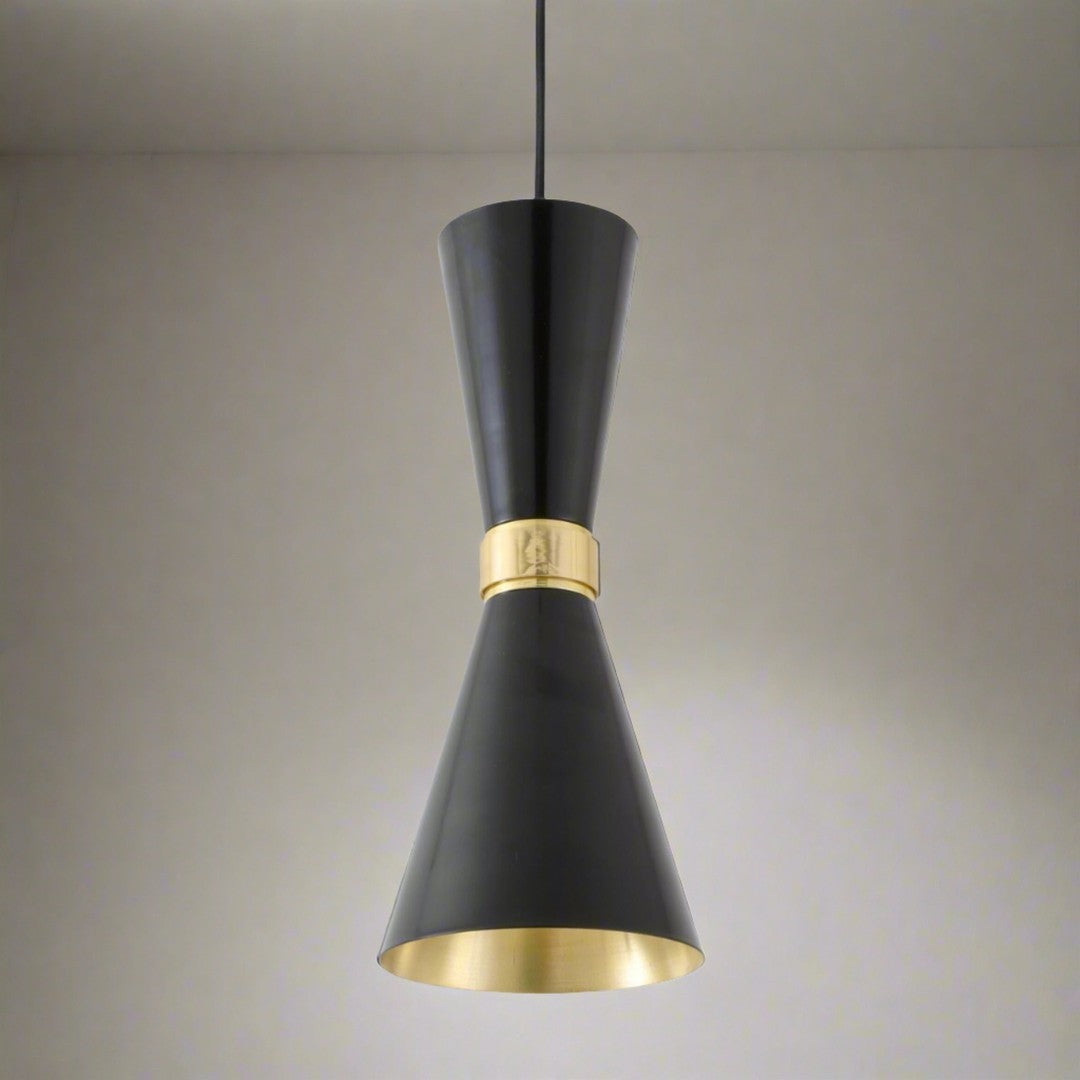 With a sleek and slim profile, the Cairo Contemporary Pendant Light in Matte Black & Polished Brass adds a touch of ambient illumination and industrial chic to your home. Designed by Mullan Lighting, the conical design of this contemporary pendant lamp make it a valuable asset over a kitchen island or office lighting.