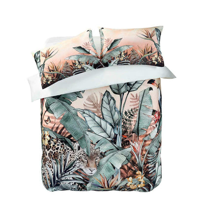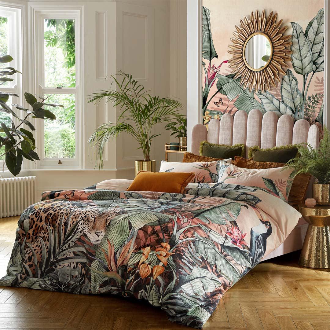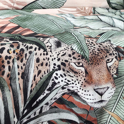 This stunning bedding in warm cantaloupe and deep sage green colour has a majestic jaguar on the prowl amongst the foliage. The perfect way to bring a little bit of the rainforest into your bedroom!