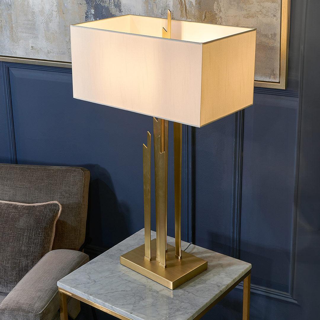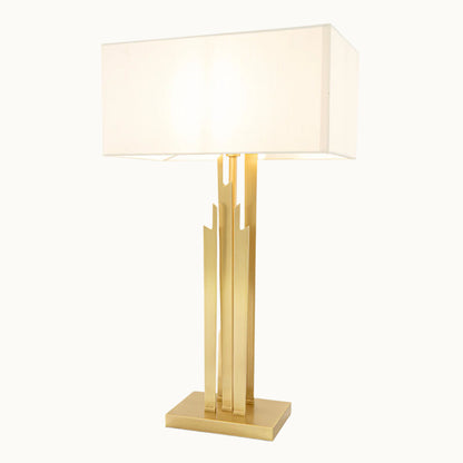 Bold and contemporary, this modern table lamp features sleek metal structures rising from a sturdy metal base, creating a dynamic and sculptural look. Topped with a crisp rectangular shade, it delivers a clean, architectural silhouette that enhances any interior space.