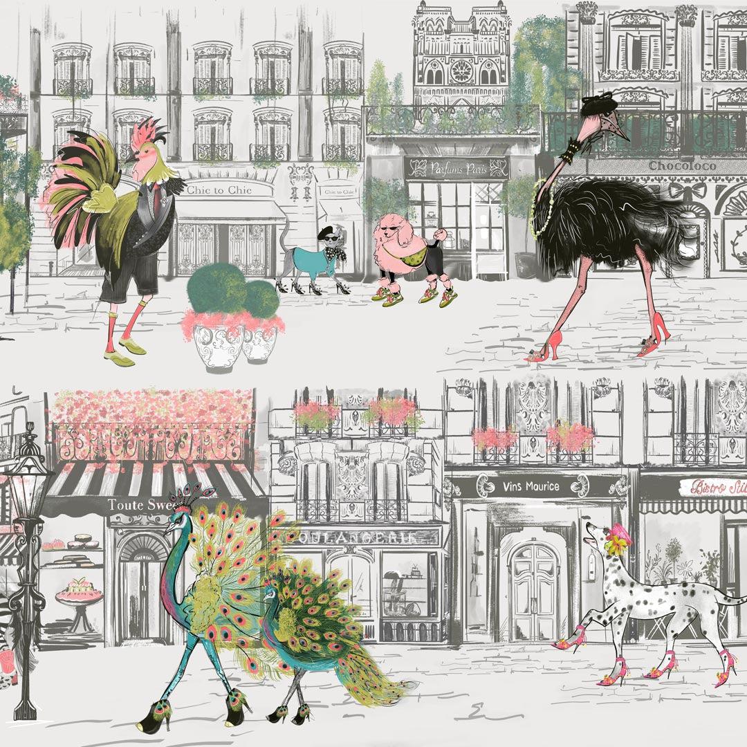 The Catwalk Wallpaper in Black & White by Brand McKenzie is here to transform your space into a stylish paradise. Inspired by the world of fashion illustration, this modern wallpaper features a captivating parade of fashionable animals strutting through the charming streets of Paris.