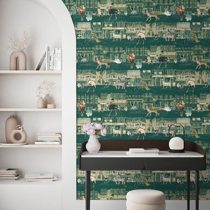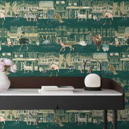 Elevate your interiors to a chic catwalk with the Catwalk Wallpaper in Kingfisher by Brand McKenzie. Drawing inspiration from fashion illustrations, this modern wallpaper infuses your home with the allure and sophistication of Paris. Envision a procession of stylish animals promenading down the magical boulevards of Paris, donning exquisite shoes and adorned with elegant accessories such as scarves, hats, and shades. Set against a captivating deep green canvas, these creatures radiate elegance and poise, transforming your walls into a dynamic fashion spectacle.
