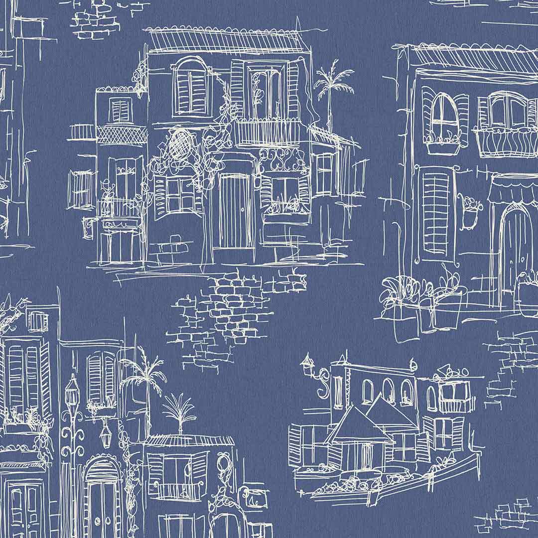 Charming Lanes Wallpaper in China Blue colourway. this statement wallpaper from Brand McKenzie has a vintage look helping you reminisce about holidays gone by. With hand-painted details bringing this wallpaper to life, each hidden lane reveals a tapestry of restaurants, cafes and idyllic homes.