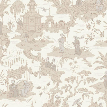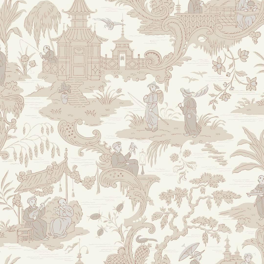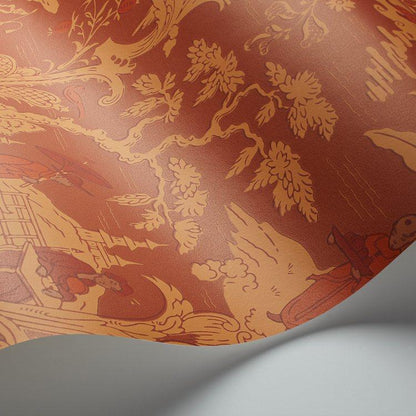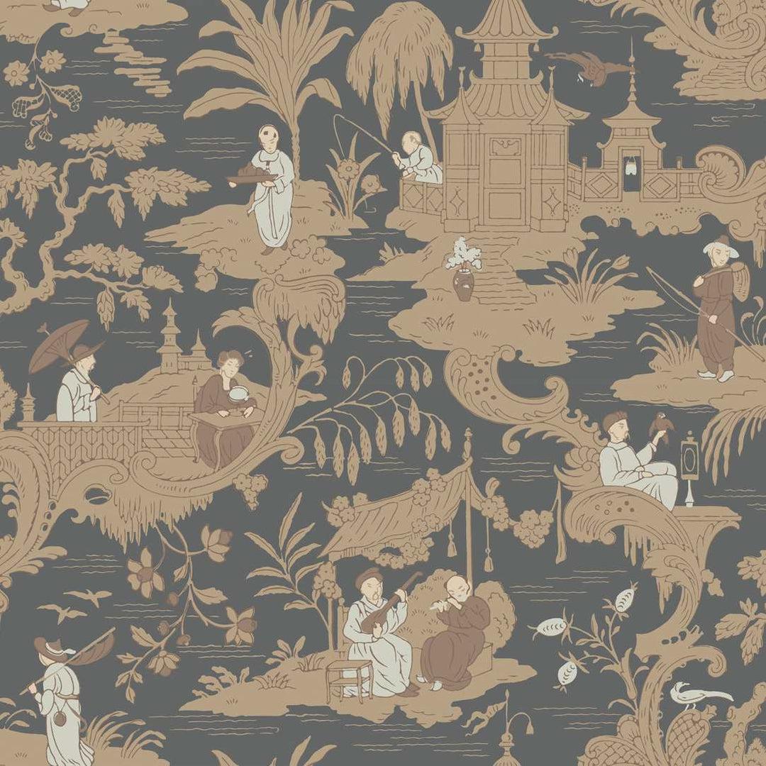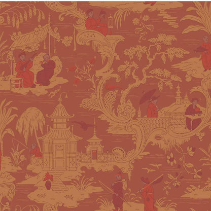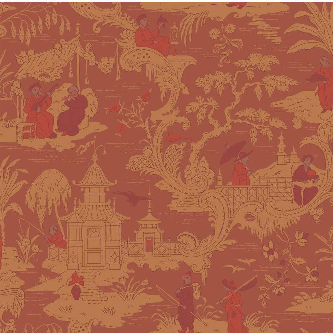 This Orientalist design features pastoral vignettes of Far Eastern life, a style that was immensely popular in Victorian times, brought bang up to date in contemporary hues of Charcoal, Ivory, Chinese Red and Drawing Room Blue.