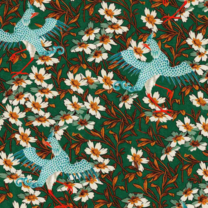 Blending Chinese symbols and motifs, the CHINOISE Wallpaper brings to life a fascinating, exquisite design. The very detailed pattern brings a white touch of efflorescence, while the bluebirds and green background set a soothing, natural garden mood. Enthralling and enchanting, this design invites spring in, as it blooms with candour.