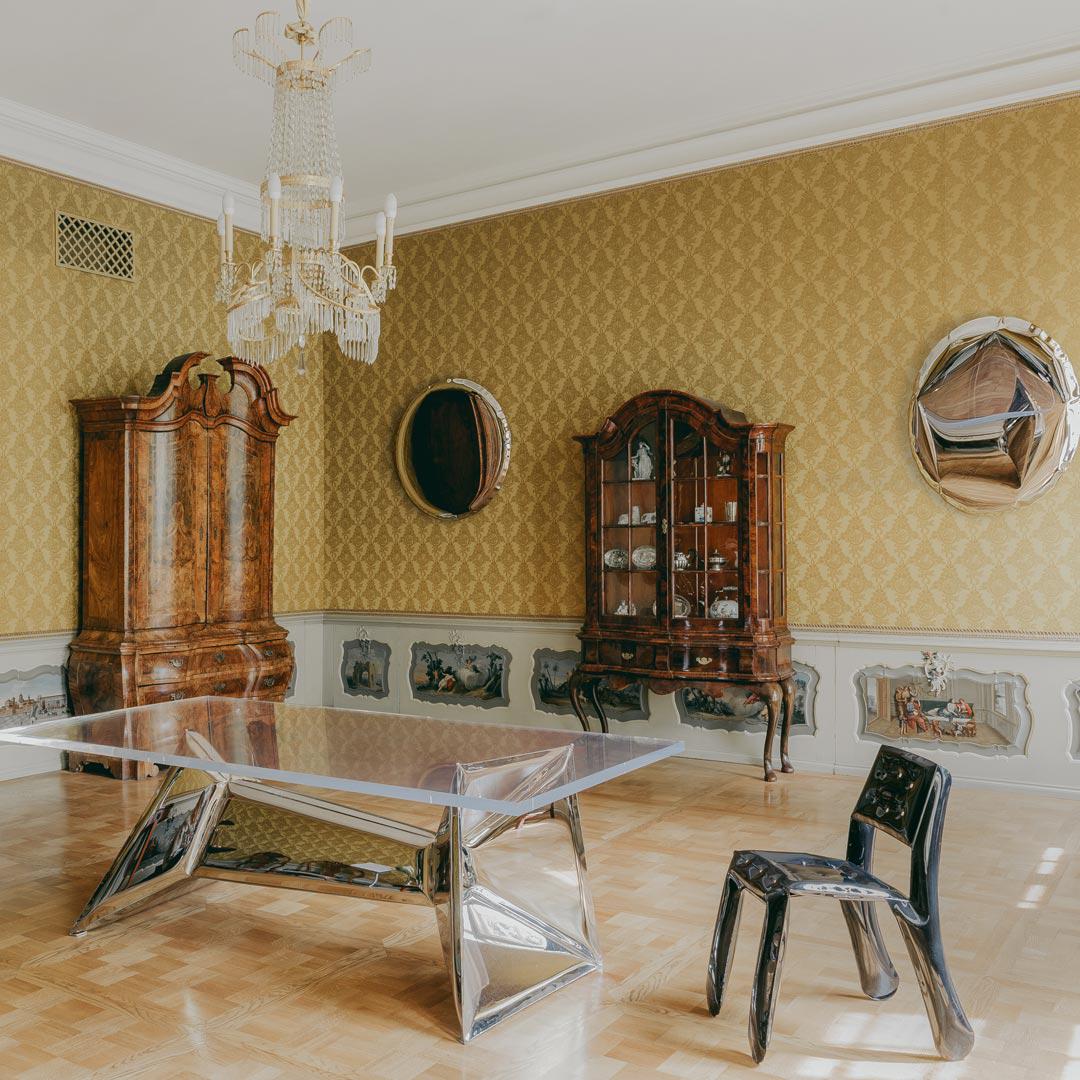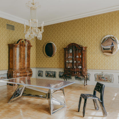 The retro style of the metal chair is a very unique and revolutionary design. The chair, made of polished steel, thanks to its mirror surface, reflects light and the surroundings, focusing attention on itself and blending into space like a chameleon.