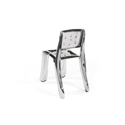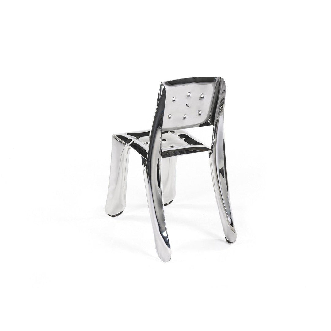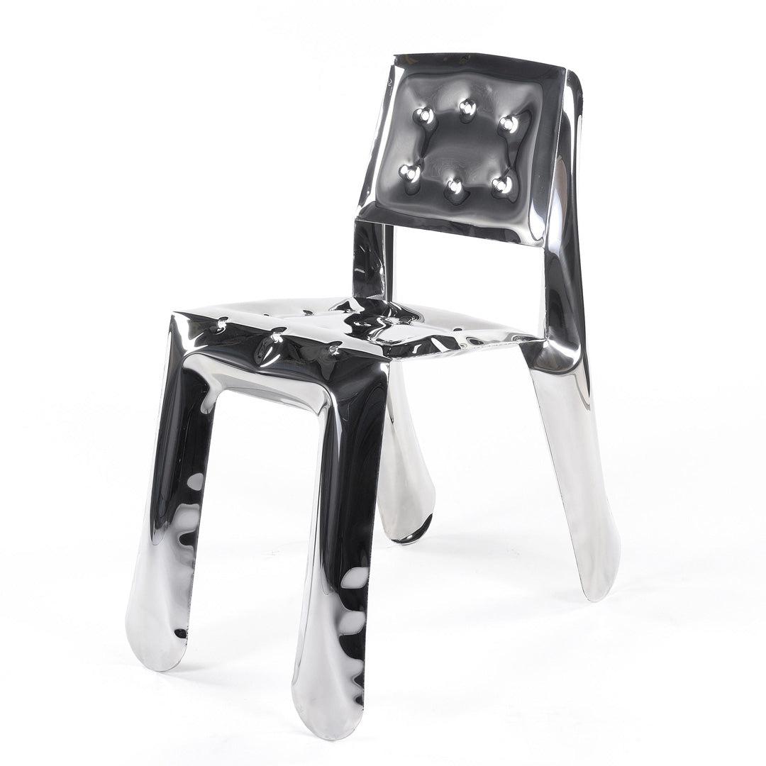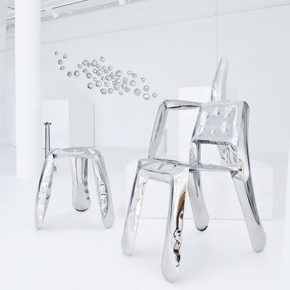 This futuristic Chippensteel Chair in Polished Inox by Polish designer Oskar Zieta echoes plastic furniture, but as it is made of steel it is extremely strong and surprisingly light. The chair has been uniquely processed and produced in FiDU technology using the bending properties of steel sheets.