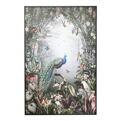 The Claude Glass Art presents a captivating scene framed by a vine-covered stone archway, leading into a misty forest. At the centre, a majestic peacock perches on a branch, its vibrant, iridescent tail flowing downward. The richly coloured tropical plants and exotic flowers surrounding the peacock create a lush, vibrant foreground, contrasting with the foggy, muted forest in the background. Various colourful birds and butterflies add movement and life to the scene, enhancing the artwork's mystical, enchanting atmosphere. Ideal for living rooms, dining areas, or nature-inspired spaces, this canvas brings a captivating blend of wildlife and tranquillity into any home, making it a stunning focal point that invites admiration.