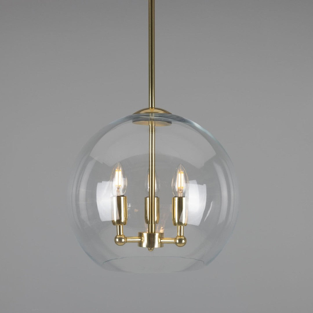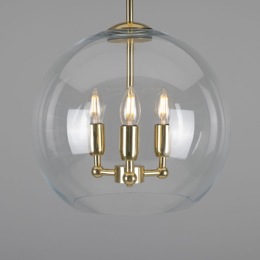 Crafted with three brass arms elegantly centred in the glass globe, this chandelier perfectly blends classic and contemporary styles. The antique brass and polished brass finish options add a luxurious touch, making it a statement piece that will enhance the overall aesthetic of your space.