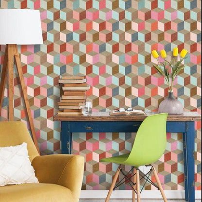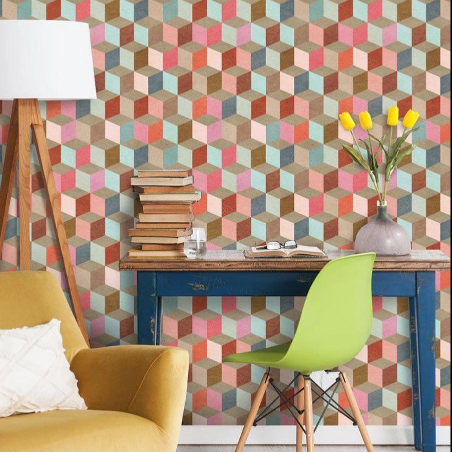 This fascinating Coloured Geometry Wallpaper by designer MINDTHEGAP is a contemporary geometric bold print in blue, red, pink and brown. Get a new fresh feeling on your walls with this flamboyant wall covering.