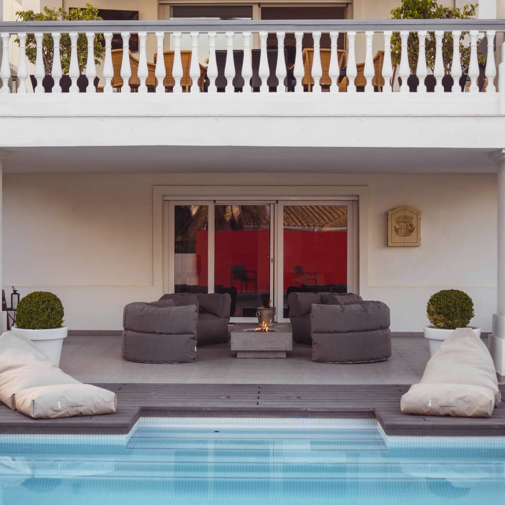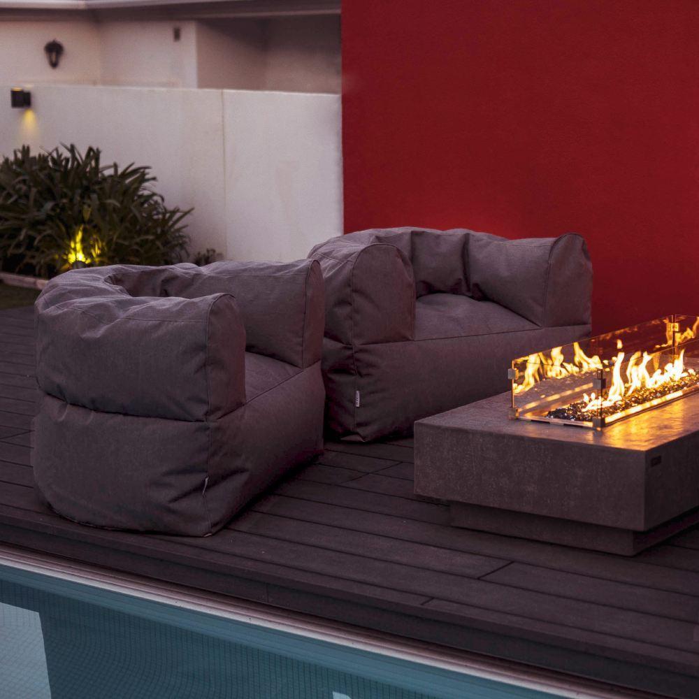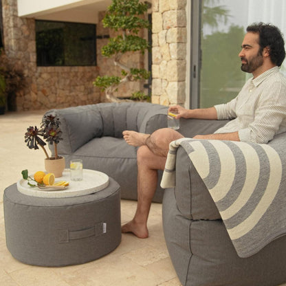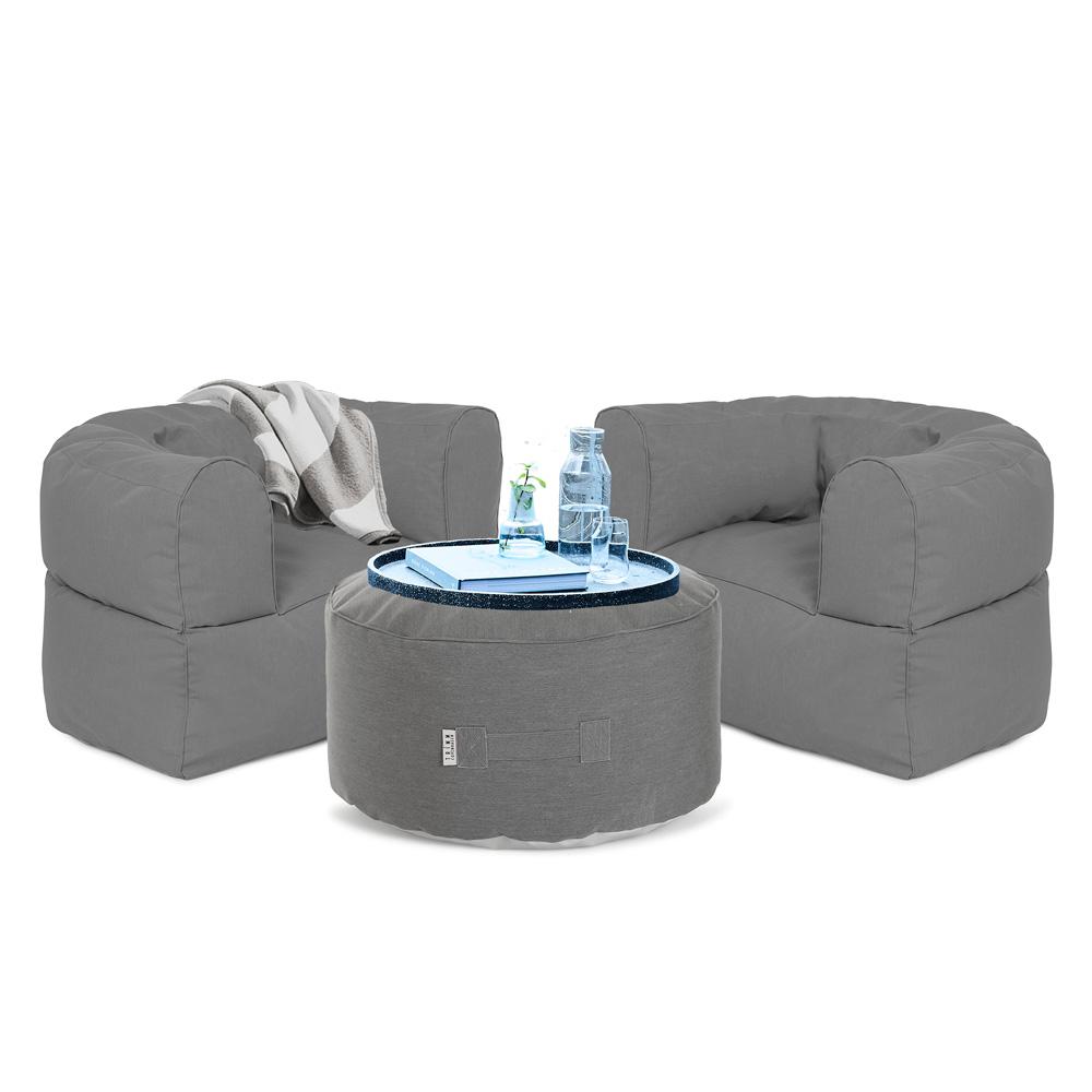 The modern Conversation outdoor seating set in grey features two comfy beanbag armchairs, a tiny moon pouffe with terrazzo tray top and a blanket to keep warm. This garden set by by TRIMM Copenhagen is perfect for couples who want to relax in comfort and it's sure to bring the wow factor to your garden, patio, deck or balcony.