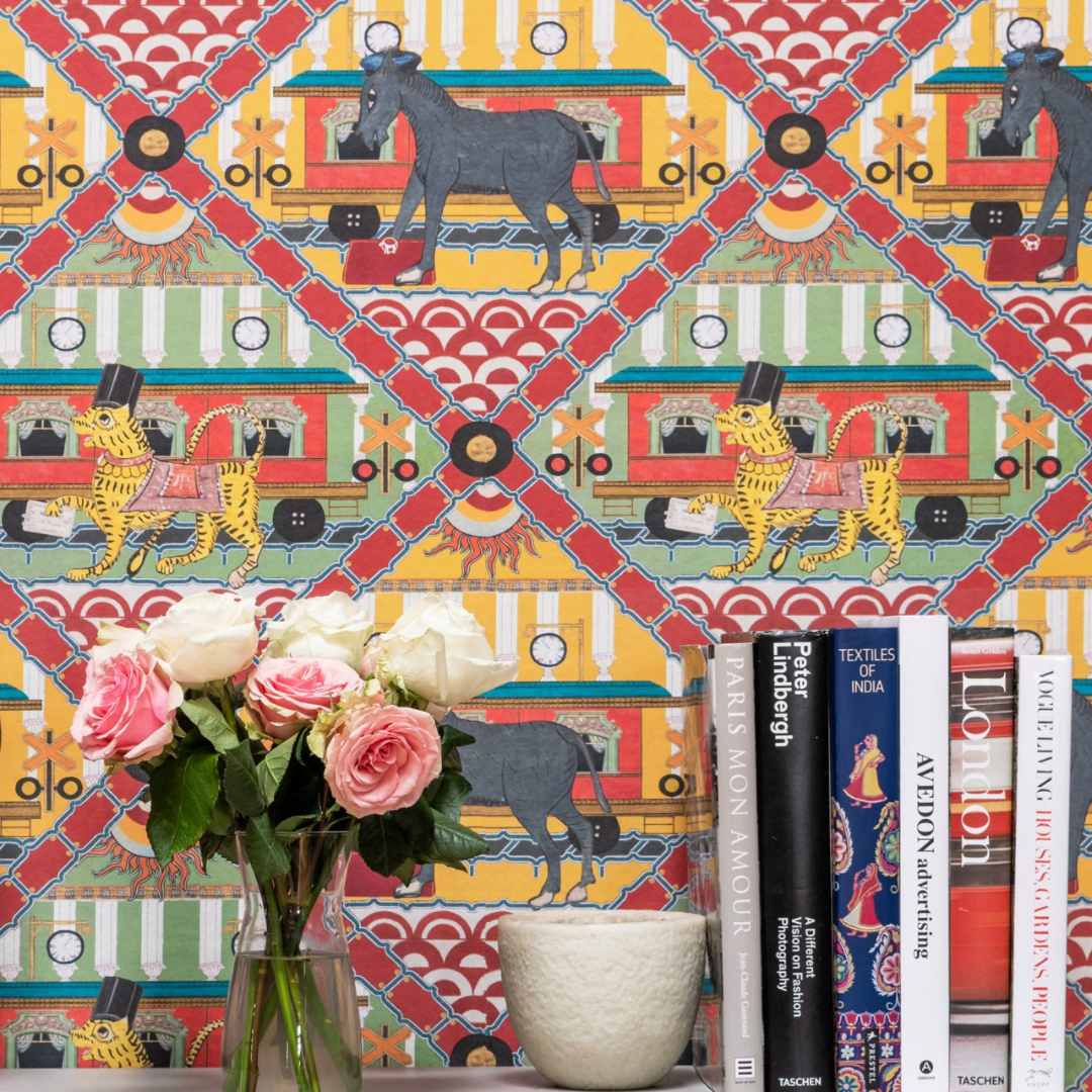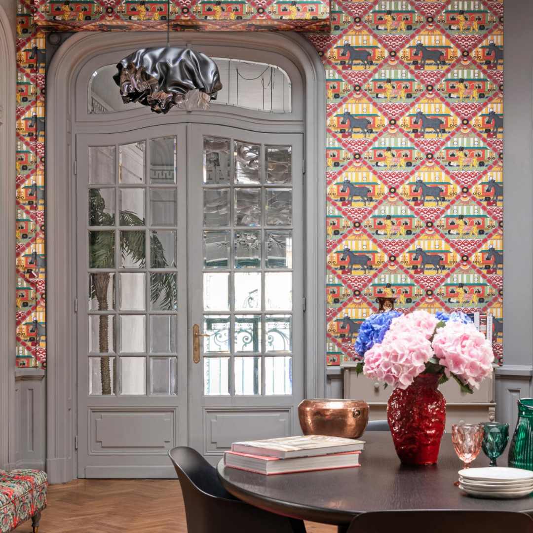 Make a statement with Gare Du Nord Wallpaper by MINDTHEGAP, a vibrant print inspired by the captivating colours and grand designs of neoclassical architecture of Gare Nu Nord. The dynamic energy of the print will dazzle and delight you each time you enter a room, as the enthralling creatures of the station parade across the paper like a rich and unforgettable show.