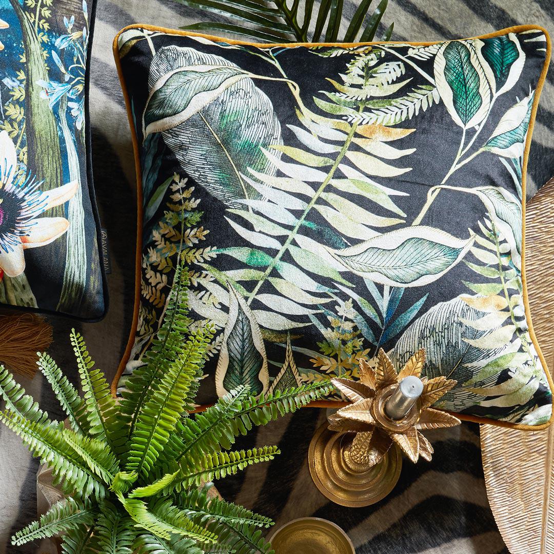 Stylish and luxurious, the Dark Tropics Velvet Cushion will add a touch of elegance to any room. Think of a moonlit jungle with tropical green leaves enveloped in the shadows of the forest nightscape, creating a beautiful and sophisticated cushion for your chair or sofa.