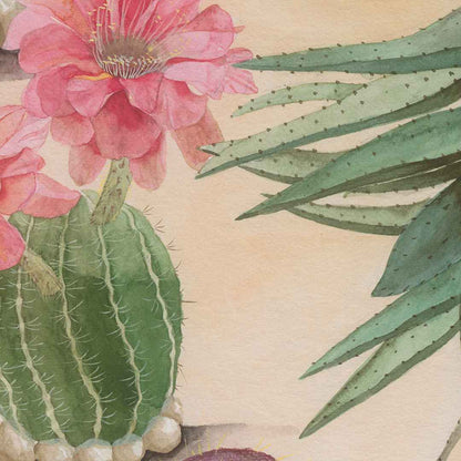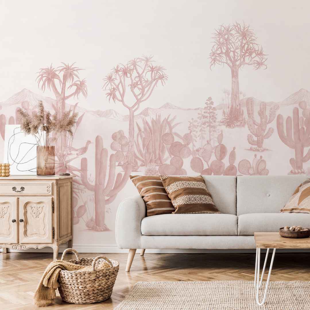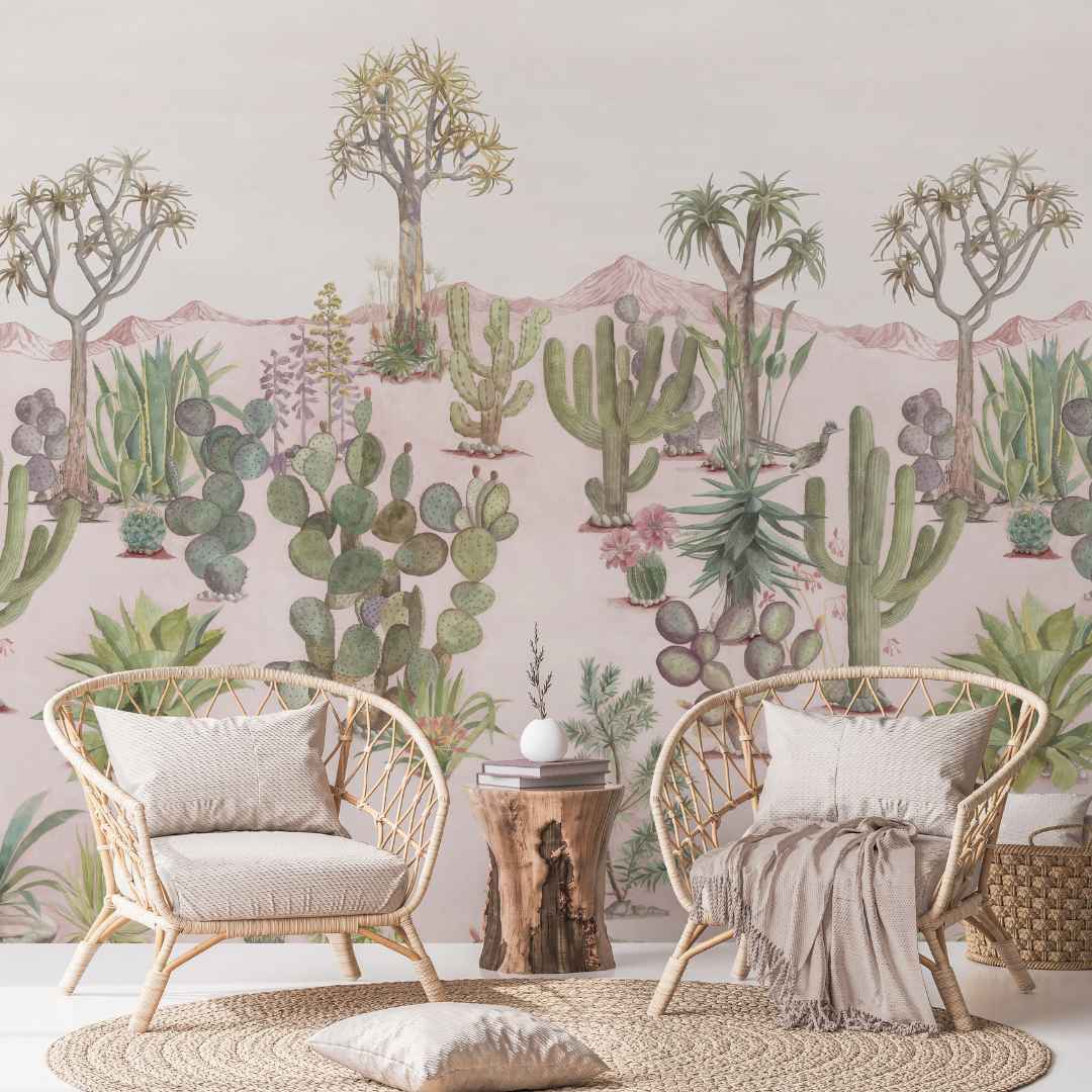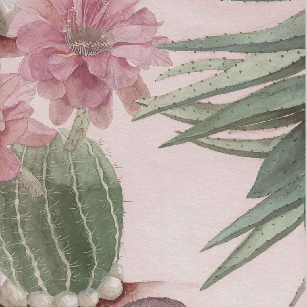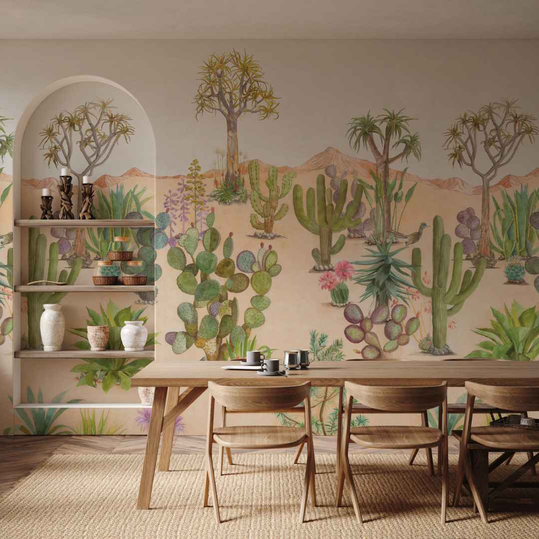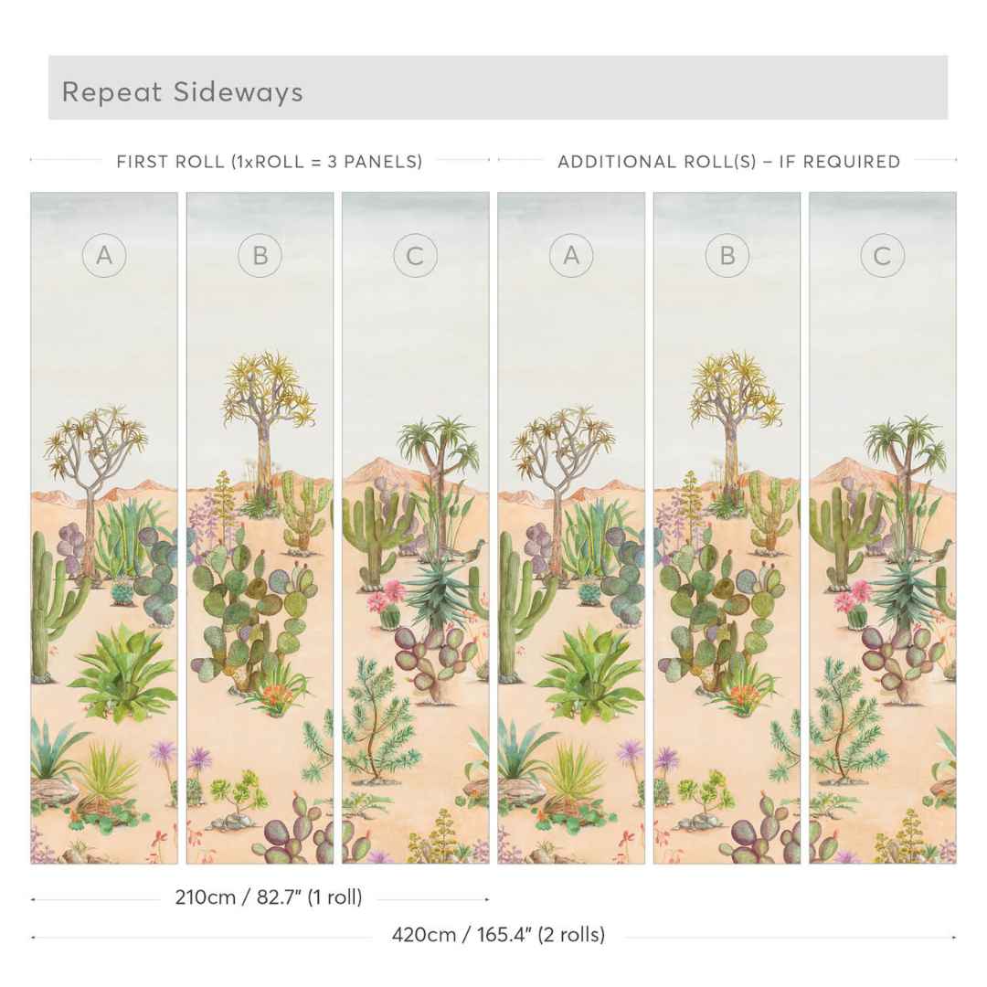 Bring your home to life with the mesmerizing beauty of Desert Mural Wallpaper by Sian Zeng. Bring a unique and lively charm to any space in your home, with a dreamscape of rolling sand dunes out of Eastern deserts. Combining Chinese brush painting with botanical illustration, this wallpaper creates captivating structure silhouettes, illuminated by sun-kissed backdrops. Marvel at the delicate hues of desert plants that burst onto the dry terrain — cacti, bromeliads and succulents that bring stunning color to every inch of the mural.