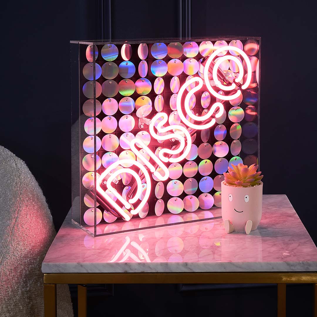 Enjoy how the iridescent sequin back catches the light and amplifies its ethereal effect. This disco neon sign is an absolute must-have if you're looking to spruce up your home or have a truly memorable gift for someone special. No decor is complete without this vibrant pink neon sign in it!