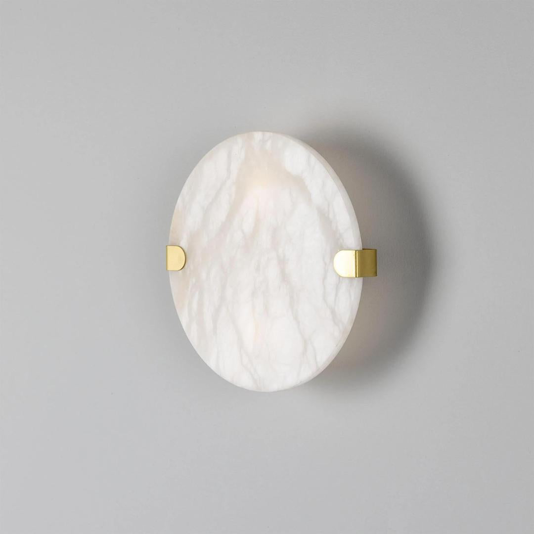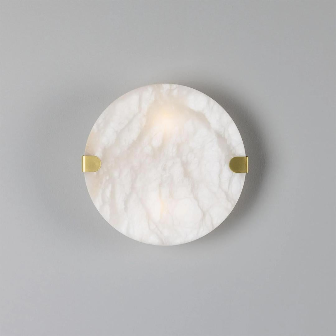 Crafted with the finest materials, the Dundee circular alabaster wall light features a beautiful round alabaster shade that emits a soft, diffused glow. The alabaster, known for its timeless beauty and durability, adds a touch of opulence to any room. Paired with delicate brass clasps, this light fixture exudes a refined and modern charm.
