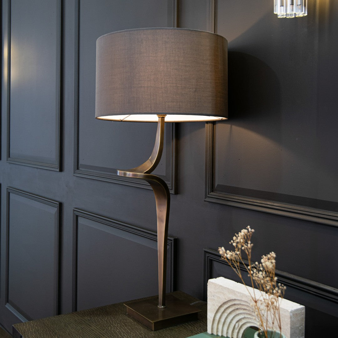 RV Astley add to their collection of stylish lighting with the Enzo Table Lamp. This antique brass lamp is a perfect example of modern living lighting, with the sculptural shape and trendy soft brown shade making it a go to contemporary light fitting. This range of designer lighting is designed in the UK and intended to fit in all rooms of your interior setting. Place in the living room to make a statement, or pair either side of a bedroom for mood lighting and ambience, the choice is yours.