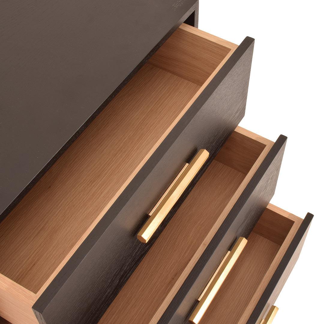 Are you looking for a stylish and functional side table to suit your home? Look no further than the Evan 3 Drawer Side Table by RV Astley! This side table has been carefully handcrafted from a rich black veneer and finished with luxurious brass trim, giving it an expensive and eye-catching look.