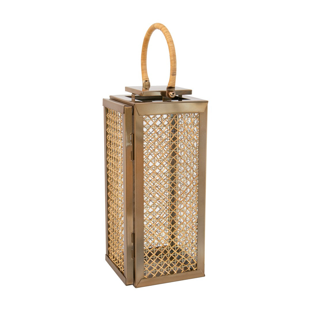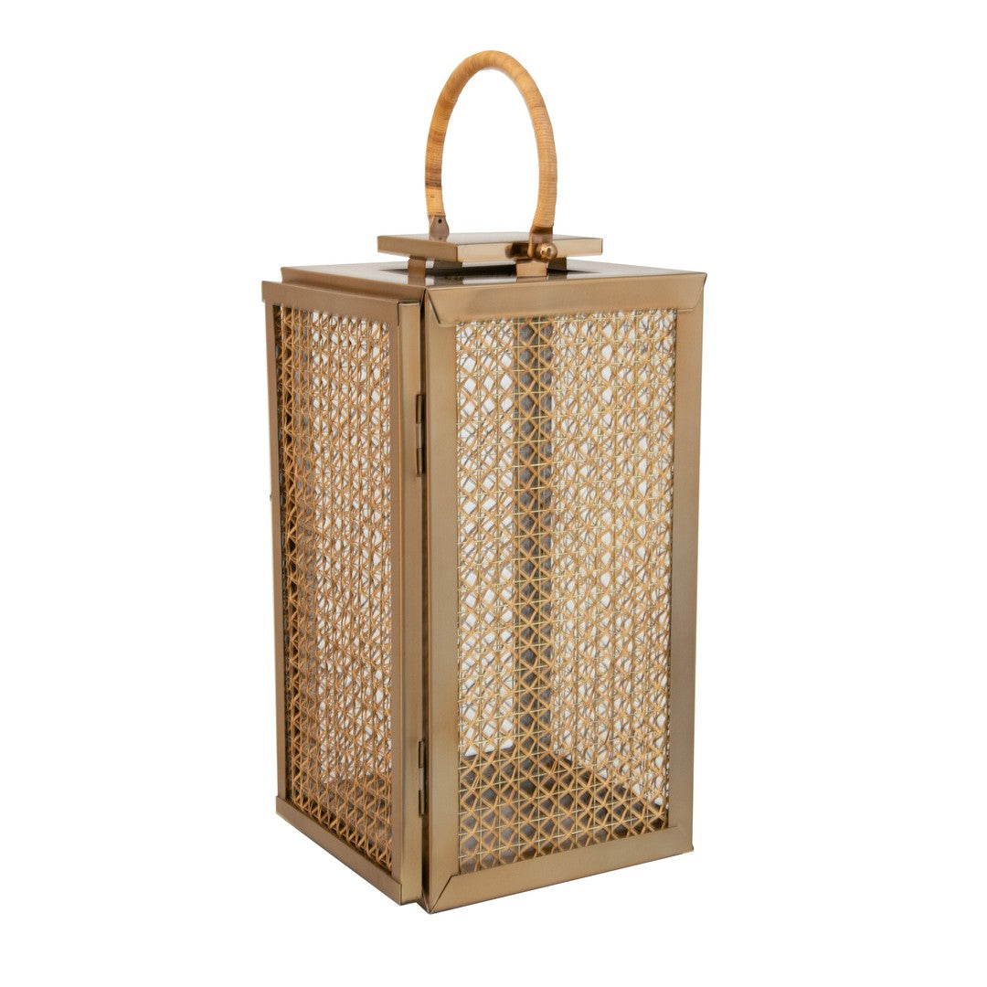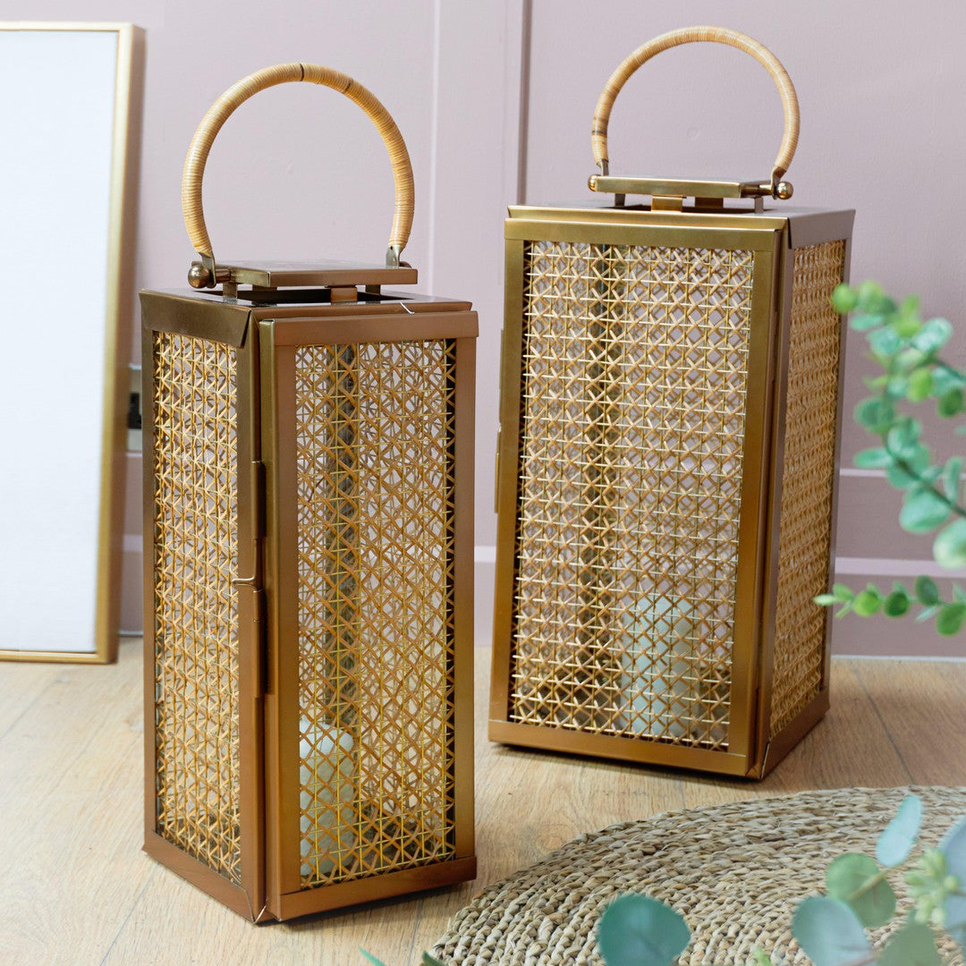 Elevate your décor with the Ewan Lantern, where the luxurious touch of brushed brass meets the inviting warmth of interwoven cane. Available in two sizes, this lantern offers versatile elegance that enhances the ambience of any space, making it a perfect addition to your home décor collection.