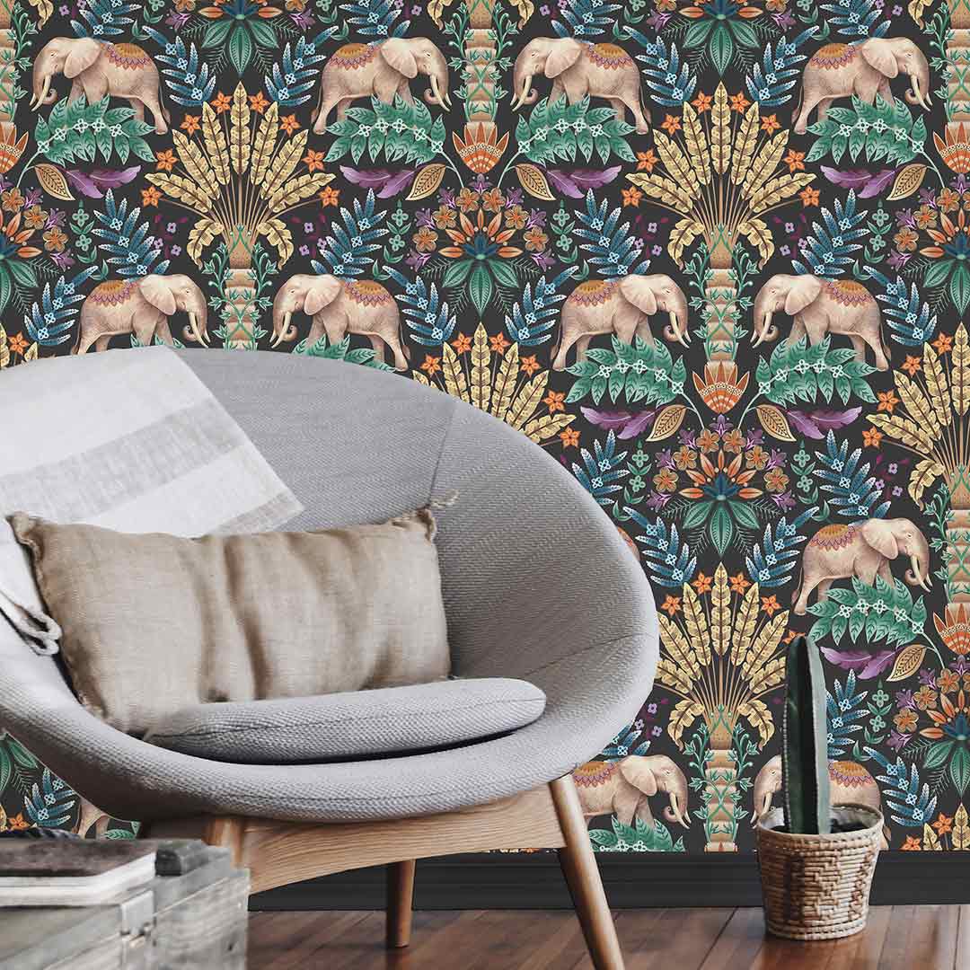 Take a journey to a far away land with our Exotic Elephant Wallpaper by Graduate Collection. This exclusive design from Richard Hayley features lush tropical palms set against a rich charcoal background, creating an air of luxury and opulence. Hand-illustrated in a decorative style reminiscent of the exotic, each magnificent elephant stands proudly amidst its vibrant tropical surroundings.