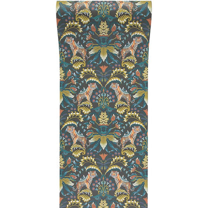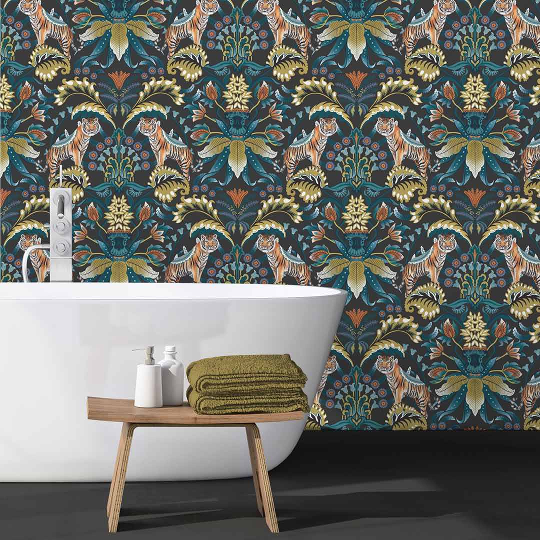 Transform any interior into a daring jungle with the Exotic Tiger wallpaper in Charcoal - Graduate Collection by Richard Hayley. This bold wallpaper brings out the most exotic wildlife and vibrant colours within your home. You'll find majestic tigers gracefully prowling through a stylised jungle of traditional floral motifs and ornamental designs.